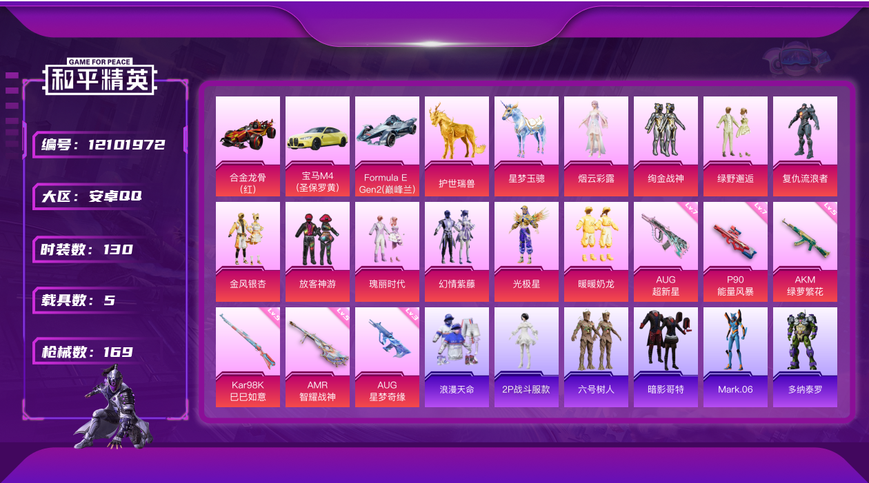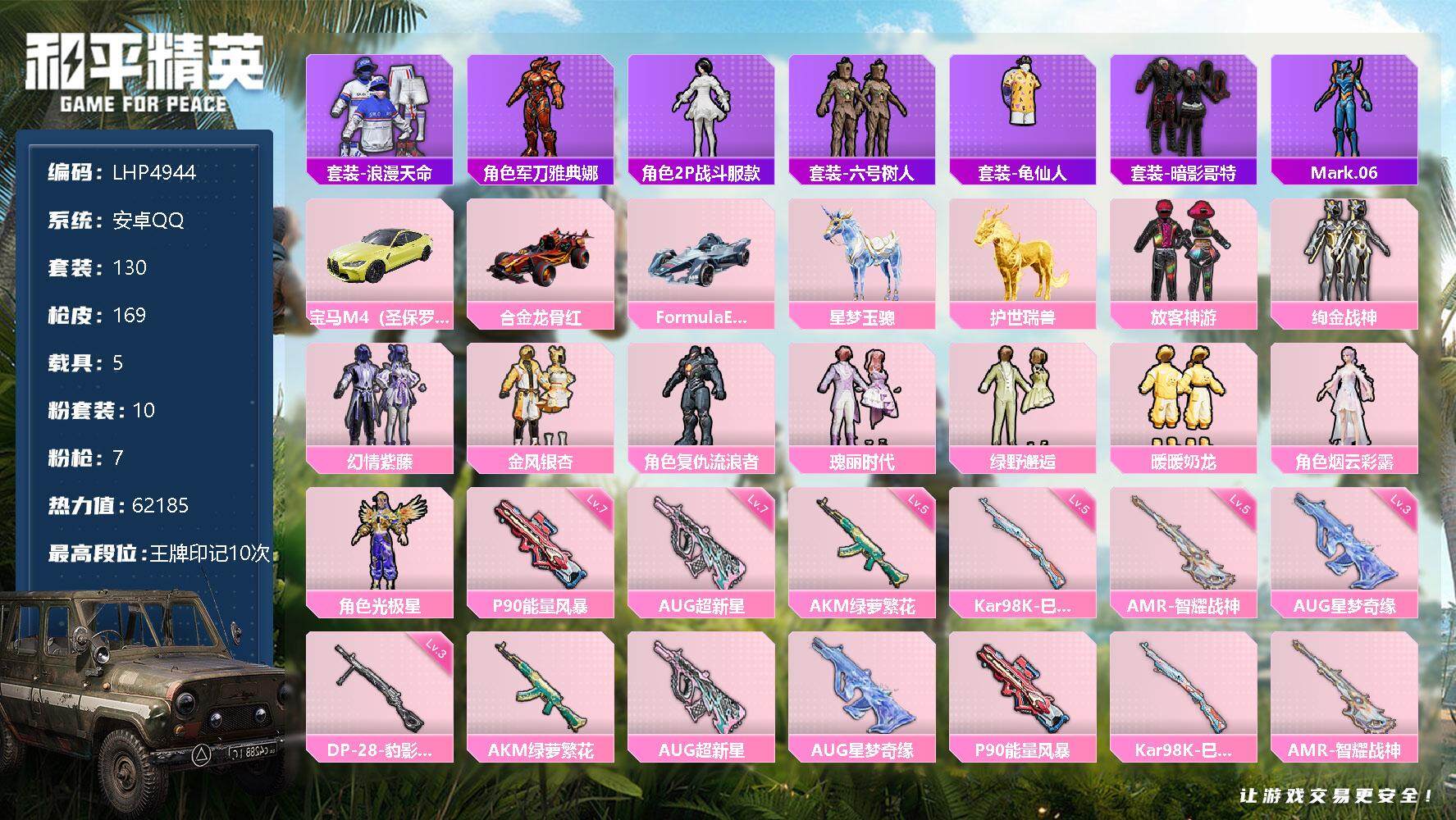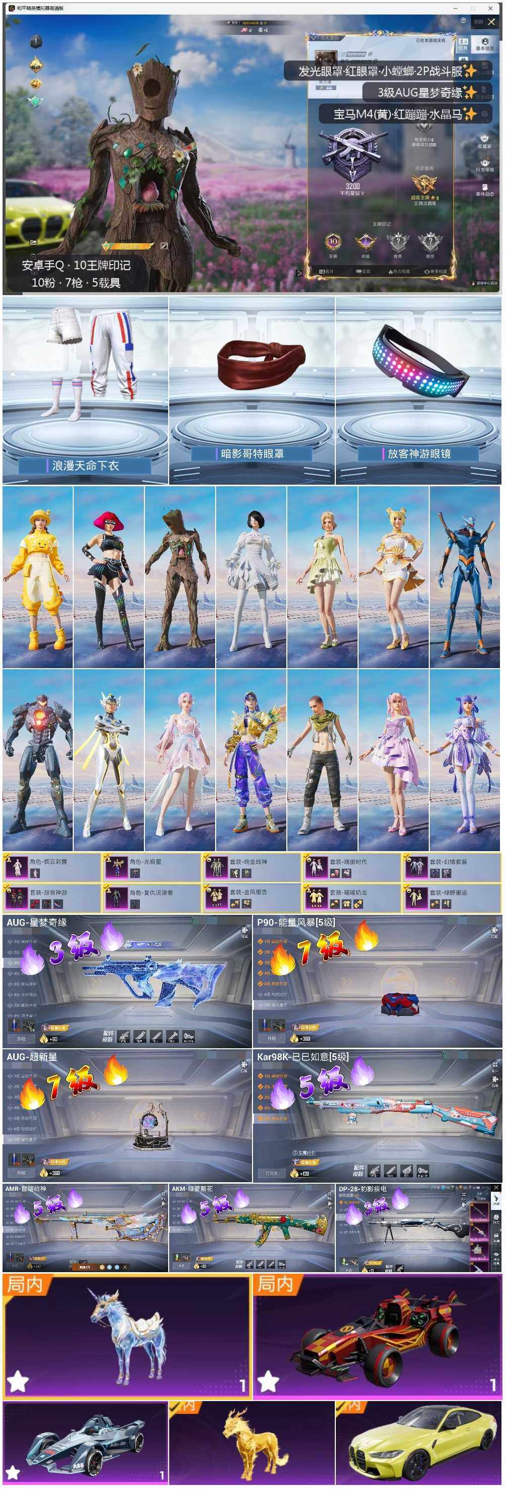 [12101972]素材身法号/地铁满天赋【特价急出/详情看图】:安卓 手Q-10粉装-7特效枪-5载具-3粉色飞行器-6.2w热力值-10王牌印记-130套装-169枪皮【热门品类】:套装-浪漫天命,角色-军刀雅典娜,角色-2P战斗服款,套装-六号树人,套装-龟仙人,套装-暗影哥特,角色-Mark.06【粉色载具】:宝马M4(圣保罗黄),合金龙骨(红),Formula E Gen2(巅峰兰),星梦玉骢,护世瑞兽【粉色套装】:粉装-放客神游,粉装-绚金战神,粉装-幻情紫藤,粉装-金风银杏,角色-复仇流浪者,粉装-瑰丽时代,粉装-绿野邂逅,粉装-暖暖奶龙,角色-烟云彩露,角色-光极星【粉色枪皮等级】:AKM-绿萝繁花(五级),AUG-超新星(七级),AUG-星梦奇缘(三级),P90-能量风暴(七级),Kar98K-巳巳如意(五级),AMR-智耀战神(五级),DP-28-豹影疾电(三级)【粉色飞行器】:星夜魔法师飞行翼,梦幻舞会飞行器,万象金身飞行器
