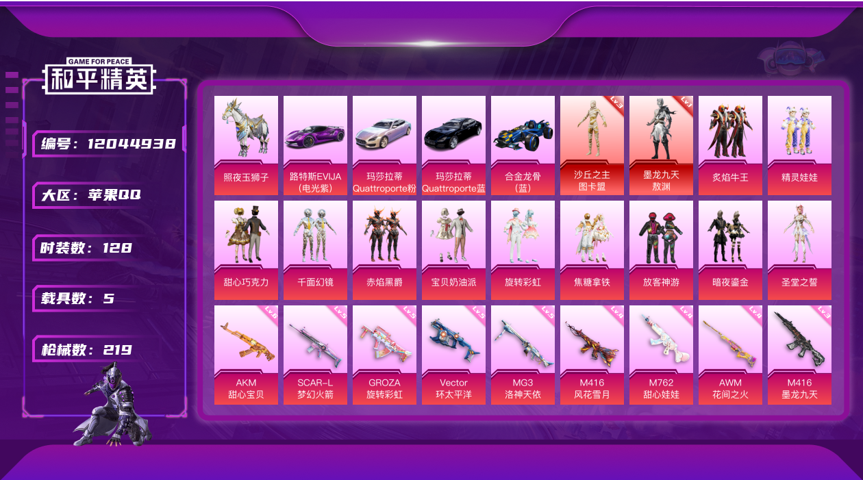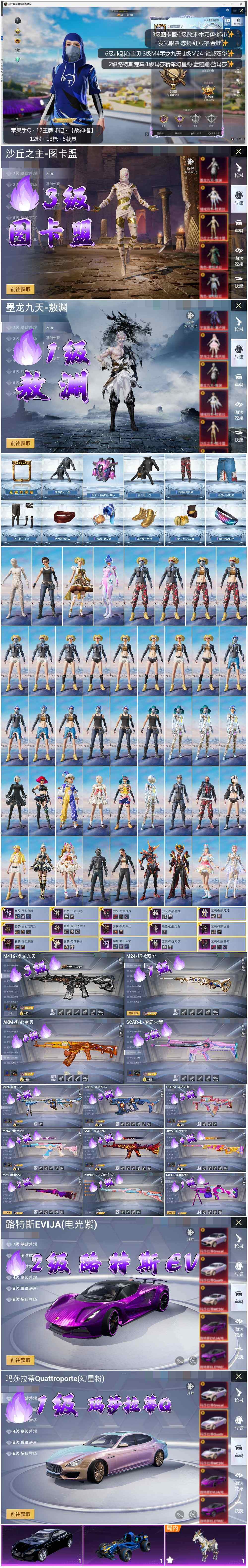 - [12264429]7粉装 3特效枪 8印记 可二次 可修改实名 身法装备:Mark.06(新蓝螳螂) 优质装备:粉色回忆,冰霜白皇,狂花道·不知火舞,AUG-许七安,七级AUG-许七安,冷漠罗丽,七级P90-冷漠罗丽,P90-冷漠罗丽,荧海星豚,Kar98K-巳巳如意 热门装扮:飒粉甜心,阿尔茜,万圣娃娃,梦魇先生 五级特效枪:五级Kar98K-巳巳如意 紫色装扮:孙悟空,幻彩翩翩,SS23特训,妙红点点,霓虹热舞,极速光影,SS31特训套装,云朵鹅,彩虹兔,雪绒豹,SS33特训套装,青涩时光,SS21特训,莱茵河畔,白兰地假日,顶瓜瓜,北国孤狼,坚韧舞者,夏日音浪,夜莺强袭者,完美偶像,帅气教官,幻世战舞者,幻影武者,萌趣咩咩,时希公主,灵公主,乐音,SS4特训,SS5特训,人气偶像,娇憨猪猪,闪银刀客,天籁歌者,SS17特训,治愈之星,迅捷之星,科技之星,SS14特训,怪笑疯兔,萌趣颜团子,SS20特训,甜心亚梦,虚音幻奏,猎梦纪元,俏皮奶喵,异彩先驱,缤纷焰火,SS18特训,雪兔飞飞,飞驰魅影,音速流光,SS19特训,军刀雅典娜,战地菁英,黄色名流,飞行日记,魅力单车,鹤鸣,黄色伏地魔,黄色运动,黑色伏地魔,龙的传人,龙腾端午,龟仙人,冰河战士,龙魂突击队,霓虹街区,跃动心情,都市漫游者,酒红色名流,酷萌兔限定,霓虹极客,野性山猫,野性战心,野性战魂,金鼠迎春,长空猛禽,雨林探路者,雪山精英,街头潮人,深蓝色名流,湖蓝色名流,滨海假日,滨海厨神,潮流炫酷,炫蓝之夏,热血青春,燃烧卡路里,牛气冲天,牛气满满,探宝勇士,极地朋克,极速红龙,橘黑制服,竞技达人朋克,红色运动,绮丽涂鸦,荧惑魅影,蓝彩潮人,蓝色运动,竞技勇士朋克,空投萌叽,疯狂小兔子,白熊同盟,白色伏地魔,破晓战魂,破蛋小黄鸡,福星高照,萝兰蝴蝶,狂花道·娜可露露,雏菊兔兔,热情海星,Mark.06(新蓝螳螂),鱼渊荷华,玉兔迎春,燕燕于飞,巳巳如意,智谋强哥,晶辉守护,石蕴玉辉,异域银装,青团波波,糖糖葫芦,竞技名士,临安公主,怀庆长公主,纯真浪花,粉红小猪,神气柴柴,懵萌河马,SS24特训(SS24特训套装),萤火魅影(套装-荧惑魅影),SS25特训,元气发射,焰鹰斗篷,幻羽潜行,蝶吟花词,情公主,小丑鱼,SS7特训,SS8特训,威严将相,玲珑飞花,SS6特训,黑夜传说,SS12特训,韶华初心,小鸟芋圆,娴静芝