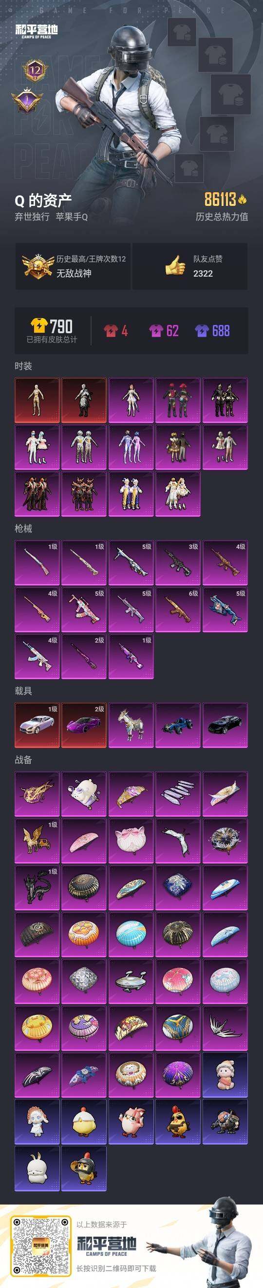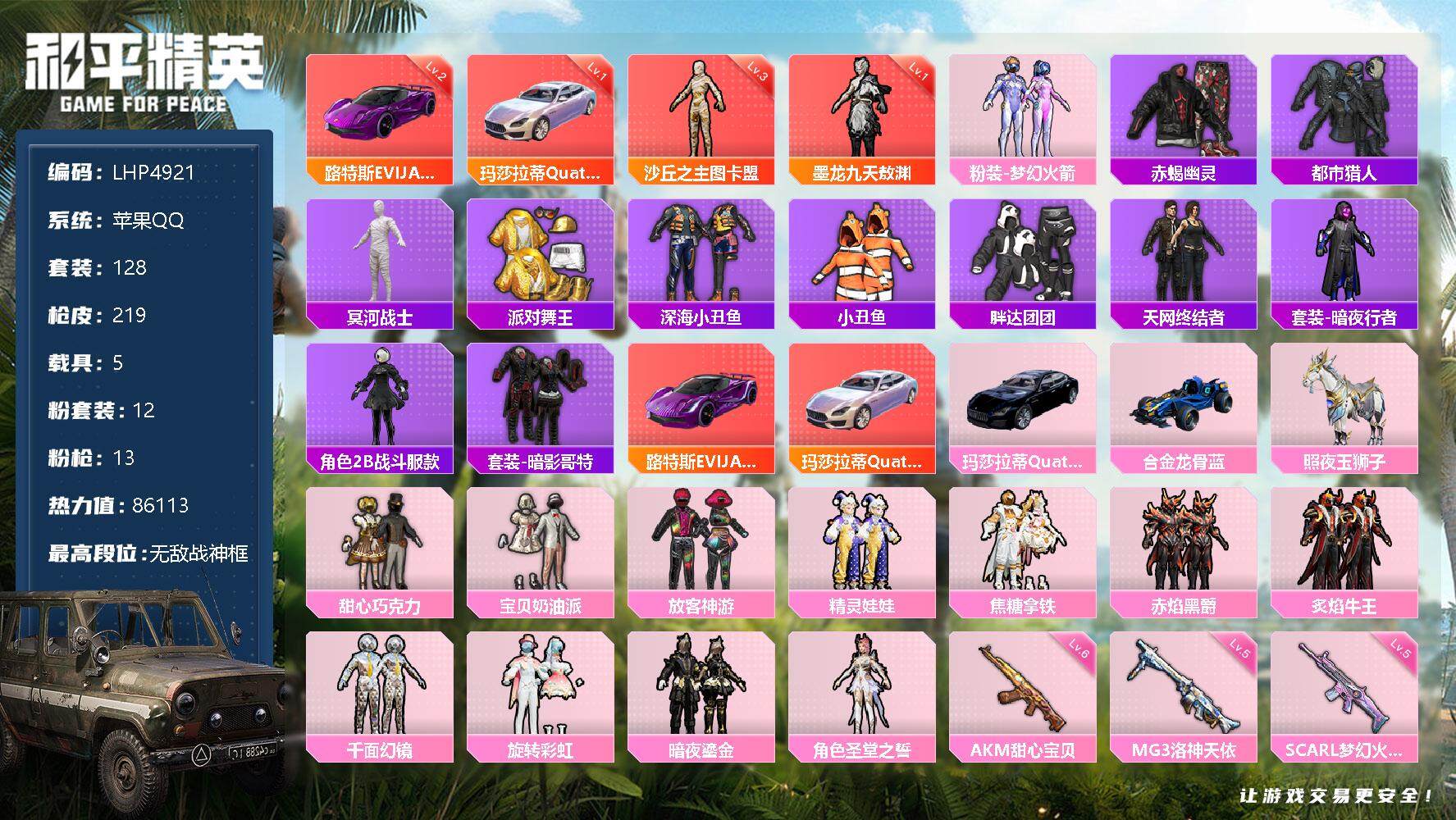 [12044938]素材身法号/老木乃伊/无敌战神框1【特价急出/详情看图】:苹果 手Q-无敌战神框-2神装-12粉装-13特效枪-5载具-8粉色飞行器-8.6w热力值-12王牌印记-128套装-219枪皮【红色载具】:路特斯EVIJA(电光紫)(二级),玛莎拉蒂Quattroporte(幻星粉)(一级)【红色神装等级】:墨龙九天-敖渊(一级),沙丘之主-图卡盟(三级)【热门品类】:粉装-梦幻火箭,套装-赤蝎幽灵,套装-都市猎人,套装-冥河战士,套装-派对舞王,套装-深海小丑鱼,套装-小丑鱼,套装-胖达团团,套装-天网终结者,套装-暗夜行者,角色-2B战斗服款,套装-暗影哥特【粉色载具】:路特斯EVIJA(电光紫),玛莎拉蒂Quattroporte(幻星粉),玛莎拉蒂Quattroporte(夜幕蓝),合金龙骨(蓝),照夜玉狮子【粉色套装】:粉装-甜心巧克力,粉装-宝贝奶油派,粉装-梦幻火箭,粉装-放客神游,粉装-精灵娃娃,粉装-焦糖拿铁,粉装-赤焰黑爵,粉装-炙焰牛王,粉装-千面幻镜,粉装-旋转彩虹,粉装-暗夜鎏金,角色-圣堂之誓【粉色枪皮等级】:AKM-甜心宝贝(六级),SCAR-L-梦幻火箭(五级),M416-风花雪月(四级),M416-墨龙九天(三级),GROZA-旋转彩虹(五级),M762-甜心娃娃(四级),Vector-环太平洋(五级),Kar98K-巳巳如意(一级),M24-暗星紫秘(二级),M24-镜域双华(一级),AWM-花间之火(四级),M249-蓝莓炮弹(一级),MG3-洛神天依(五级)【粉色飞行器】:酣梦熊熊飞行器,天之羽翼飞行器,闪光银龙飞行器,千面幻镜飞行器,沙丘之主天马,镜域双华-灵镜之阶,龙翔九天飞行器,万象金身飞行器