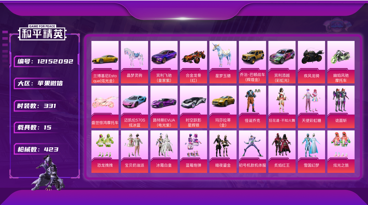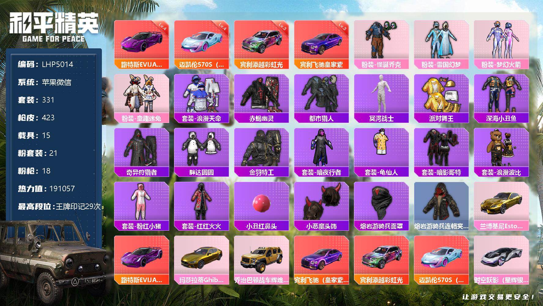 [12152092]素材身法号/老木乃伊/满绝世印记12/迈凯伦570S(炫冰蓝)(四级)/路特斯EVIJA(电光紫)(四级)【特价急出/详情看图】:苹果 微信-21粉装-18特效枪-15载具-7粉色飞行器-19.1w热力值-29王牌印记-331套装-423枪皮【红色载具】:路特斯EVIJA(电光紫)(四级),迈凯伦570S(炫冰蓝)(四级),宾利添越(彩虹光)(三级),宾利飞驰(皇家紫)(三级)【热门品类】:粉装-怪诞乔克,粉装-雪国幻梦,粉装-梦幻火箭,粉装-童趣迷兔,套装-浪漫天命,套装-赤蝎幽灵,套装-都市猎人,套装-冥河战士,套装-派对舞王,套装-深海小丑鱼,套装-奇异狩猎者,套装-胖达圆圆,套装-金羽特工,套装-暗夜行者,套装-龟仙人,套装-暗影哥特,套装-浪漫波比,套装-粉红小猪,套装-红红火火,小丑红鼻头,小恶魔头饰,熔岩游骑兵面罩,熔岩游骑兵连帽夹克【粉色载具】:兰博基尼Estoque(炫光金),路特斯EVIJA(电光紫),玛莎拉蒂Ghibli(金),乔治巴顿战车(辉煌金),宾利飞驰(皇家紫),宾利添越(彩虹光),迈凯伦570S(炫冰蓝),时空跃影(星辉银),合金龙骨(红),疾风龙骑,幽焰风驰摩托车,盛世惊鸿摩托车,星梦玉骢,晶梦灵驹【粉色套装】:粉装-怪诞乔克,粉装-宝贝奶油派,粉装-天使彩虹糖,粉装-雪国幻梦,粉装-梦幻火箭,粉装-金风玉露,粉装-新星烈龙,粉装-诡面斩,粉装-草莓生巧,粉装-冰霜白皇,粉装-童趣迷兔,粉装-炙焰红王,粉装-绿野柔风,粉装-葫芦兄弟,角色-初号机款机体服,粉装-蓝莓炮弹,粉装-恐龙拽拽,粉装-炙焰牛王,粉装-暗夜鎏金,粉装-炫光之旅,角色-狂花道·不知火舞【粉色枪皮等级】:AKM-甜心宝贝(七级),AKM-炫紫旋律(七级),AKM-梦之光华(二级),AKM-幽焰骑士(三级),SCAR-L-锦绣绵绵(五级),M416-五爪金龙(七级),M416-风花雪月(一级),M416-超新星(三级),AUG-暖羊咩咩(五级),M762-激战未来(五级),UZI-筑梦精灵(四级),Kar98K-伏魔团(五级),Kar98K-巳巳如意(五级),Mk14-盛世惊鸿(三级),DP-28-豹影疾电(一级),MG-36-幻彩电音(一级)【粉色飞行器】:神秘黑猫飞行器,超新星飞行器,龙翔九天飞行器,幽焰列车飞行器,凤舞九天飞行器,万象金身飞行器,圣域金龙飞行