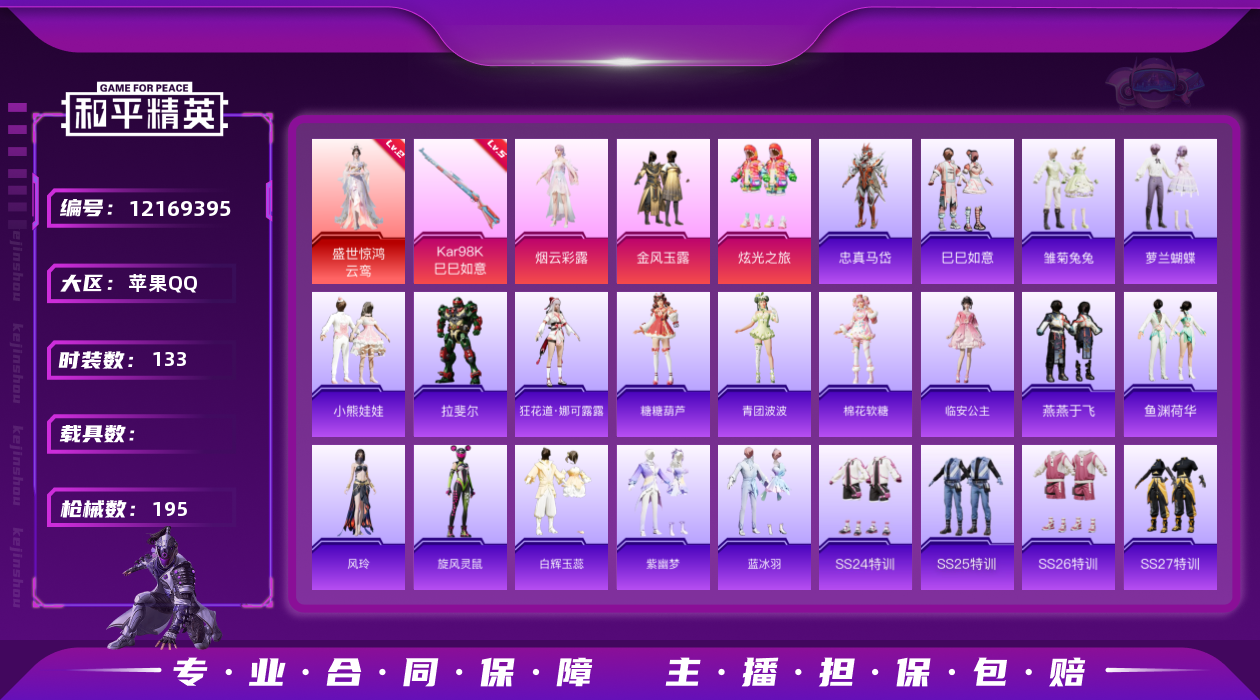 [12169395]MQ605-有二次-苹果-1红装-3粉装-1特效枪-0载具-55774热力值-12印记-131套装-195枪皮 【红色神装等级】:盛世惊鸿-云鸾(二级) 【热门品类】:角色-军刀雅典娜,角色-忠真马岱,套装-龟仙人,撬棍-龙胆亮银枪 【粉色套装】:粉装-金风玉露,粉装-炫光之旅,角色-烟云彩露 【粉色枪皮等级】:Kar98K-巳巳如意(五级) 【粉色枪皮】:Kar98K-巳巳如意 【粉色飞行器】:星之彼岸飞行器,闪光银龙飞行器,霓虹漫游飞行器,冠军兔兔飞行器 【粉色降落伞】:百万伏特降落伞,锦绣火鲤降落伞,暗夜玫瑰降落伞,垂柳戏鸭降落伞,彩虹甜喵降落伞,圣堂之誓降落伞,沙丘之主降落伞,猪猪侠降落伞,精灵梦叶罗丽降落伞,创世·救赎降落伞,金丰海韵降落伞,千金淑猫降落伞,月影灵韵降落伞,鬼刀降落伞,樱桃泡泡降落伞,星穹咏叹调降落伞 【稀有套装】:套装-龟仙人,套装-巳巳如意,套装-雏菊兔兔,套装-萝兰蝴蝶,套装-小熊娃娃,角色-拉斐尔,角色-狂花道·娜可露露,套装-糖糖葫芦,套装-青团波波,套装-棉花软糖,角色-临安公主,套装-燕燕于飞,套装-鱼渊荷华,角色-风玲,套装-旋风灵鼠,套装-白辉玉蕊,套装-紫幽梦,套装-蓝冰羽 【稀有枪皮】:AKM-彩虹符号,AKM-影袭,AKM-恐龙拽拽,AKM-星之信仰,AKM-灼热熔岩,AKM-环太平洋,AKM-生命誓言,AKM-破晓战魂,AKM-霓虹街区,AKM-龙的传人,AKM-玄冥寒域,M16A4-幻世战舞者,M16A4-甜心亚梦,M16A4-红色方程式,M16A4-千金淑猫,SCAR-L-夜灯,SCAR-L-玉兔迎春,SCAR-L-红色方程式,SCAR-L-净心行者,M416-暗夜行者,M416-糯团青竹,M416-红色方程式,M416-蓝色火焰,GROZA-2B战斗服款,GROZA-彩虹符号,GROZA-影袭,AUG-2P战斗服款,AUG-耀粉歌者,AUG-金蛇镇世,QBZ-洛神天依,M762-绒雪飘舞,M762-诡娃娃,G36C-星穹咏叹调,AC-VAL-天降萌叽,AC-VAL-快闪甜心,AC-VAL-甜心亚梦,AC-VAL-闲梦青缨,蜜獾-垂柳戏鸭,蜜獾-天降萌叽,蜜獾-娇憨猪猪,UZI-啾咪啾咪,UZI-天降萌叽,UZI-娇憨猪猪,UZI-红色方程式,UMP45-夜灯,UMP45-时空追击者,UMP45-蓝色火焰,V