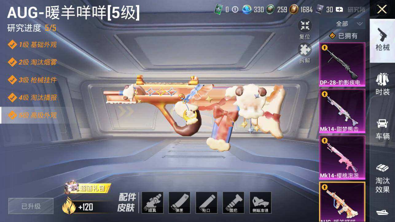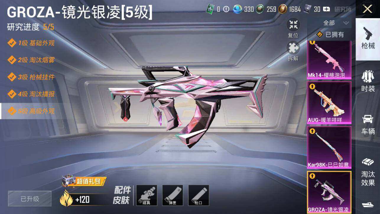 【粉色枪皮等级】:GROZA-镜光银凌(五级),AUG-暖羊咩咩(五级),Kar98K-巳巳如意(五级),Mk14-樱桃泡泡(五级),Mk14-甜梦熊击(五级),DP-28-豹影疾电(三级)