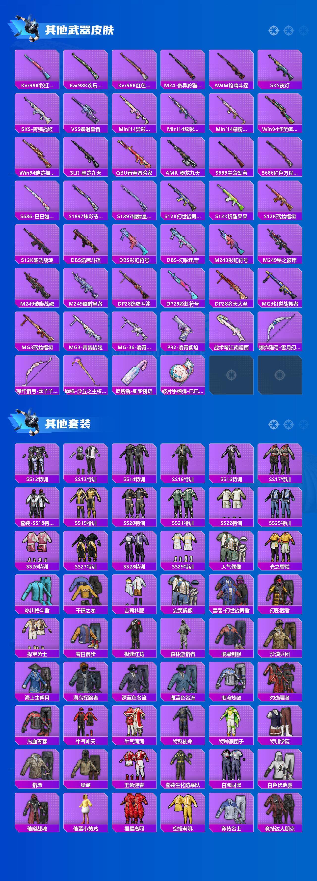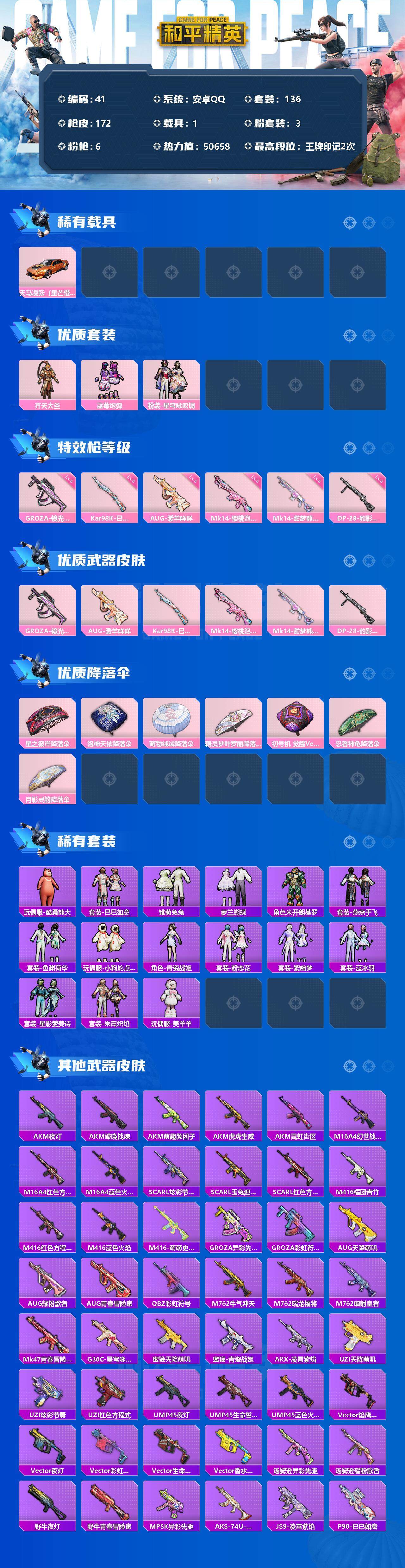 [12171621]【商品标题】:MQ869-安卓 手Q-3粉装-6特效枪-1载具-0粉色飞行器-50658热力值-2王牌印记-136套装-172枪皮 【热门品类】:套装-龟仙人,套装-粉红小猪 【粉色载具】:天马凌跃(星芒橙) 【粉色套装】:粉装-齐天大圣,粉装-蓝莓炮弹,粉装-星穹咏叹调 【粉色枪皮等级】:GROZA-镜光银凌(五级),AUG-暖羊咩咩(五级),Kar98K-巳巳如意(五级),Mk14-樱桃泡泡(五级),Mk14-甜梦熊击(五级),DP-28-豹影疾电(三级) 【粉色枪皮】:GROZA-镜光银凌,AUG-暖羊咩咩,Kar98K-巳巳如意,Mk14-樱桃泡泡,Mk14-甜梦熊击,DP-28-豹影疾电 【粉色降落伞】:星之彼岸降落伞,洛神天依降落伞,萌物绒绒降落伞,精灵梦叶罗丽降落伞,初号机 觉醒Ver.降落伞,忍者神龟降落伞,月影灵韵降落伞 【稀有套装】:套装-龟仙人,玩偶服-酷勇熊大,套装-巳巳如意,套装-雏菊兔兔,套装-萝兰蝴蝶,角色-米开朗基罗,套装-燕燕于飞,套装-鱼渊荷华,玩偶服-小狗蛇点点,角色-青瓷战姬,套装-粉恋花,套装-紫幽梦,套装-蓝冰羽,套装-星影赞美诗,套装-朱霞炽焰,玩偶服-美羊羊 【稀有枪皮】:AKM-夜灯,AKM-破晓战魂,AKM-萌趣颜团子,AKM-虎虎生威,AKM-霓虹街区,M16A4-幻世战舞者,M16A4-红色方程式,M16A4-蓝色火焰,SCAR-L-炫彩节奏,SCAR-L-玉兔迎春,SCAR-L-红色方程式,M416-糯团青竹,M416-红色方程式,M416-蓝色火焰,M416-萌萌史莱姆,GROZA-异彩先驱,GROZA-彩虹符号,AUG-天降萌叽,AUG-耀粉歌者,AUG-青春冒险家,QBZ-彩虹符号,M762-牛气冲天,M762-瑞龙福将,M762-镭射皇者,Mk47-青春冒险家,G36C-星穹咏叹调,蜜獾-天降萌叽,蜜獾-青瓷战姬,ARX-凌霄紫焰,UZI-天降萌叽,UZI-炫彩节奏,UZI-红色方程式,UMP45-夜灯,UMP45-生命誓言,UMP45-蓝色火焰,Vector-焰鹰斗篷,Vector-夜灯,Vector-彩虹符号,Vector-生命誓言,Vector-香水柠檬,汤姆逊-异彩先驱,汤姆逊-耀粉歌者,野牛-夜灯,野牛-青春冒险家,MP5K-异彩先驱,AKS-74U-鬼刀,JS9-凌霄紫焰,P90-巳巳如