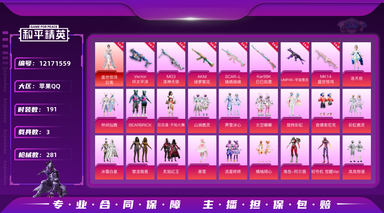 [12171559]【商品标题】:MQ798-苹果 手Q-1神装-20粉装-7特效枪-3载具-10粉色飞行器-98224热力值-15王牌印记-191套装-281枪皮