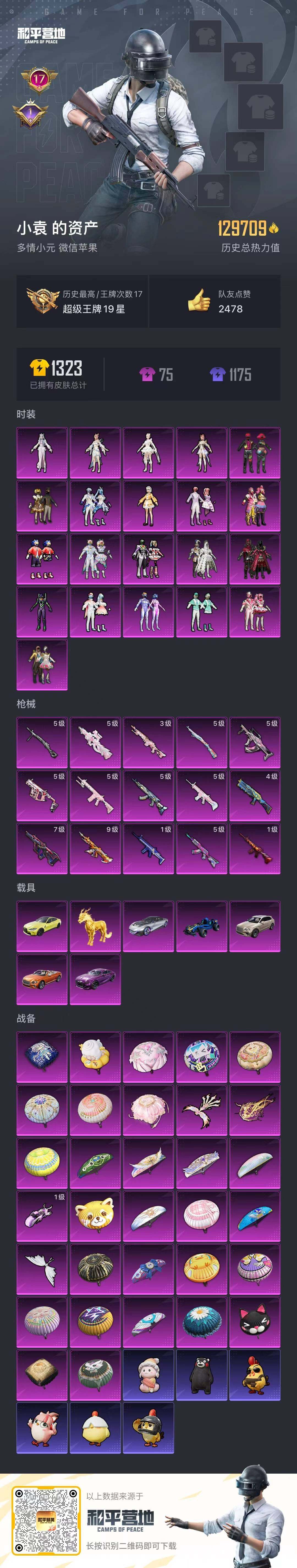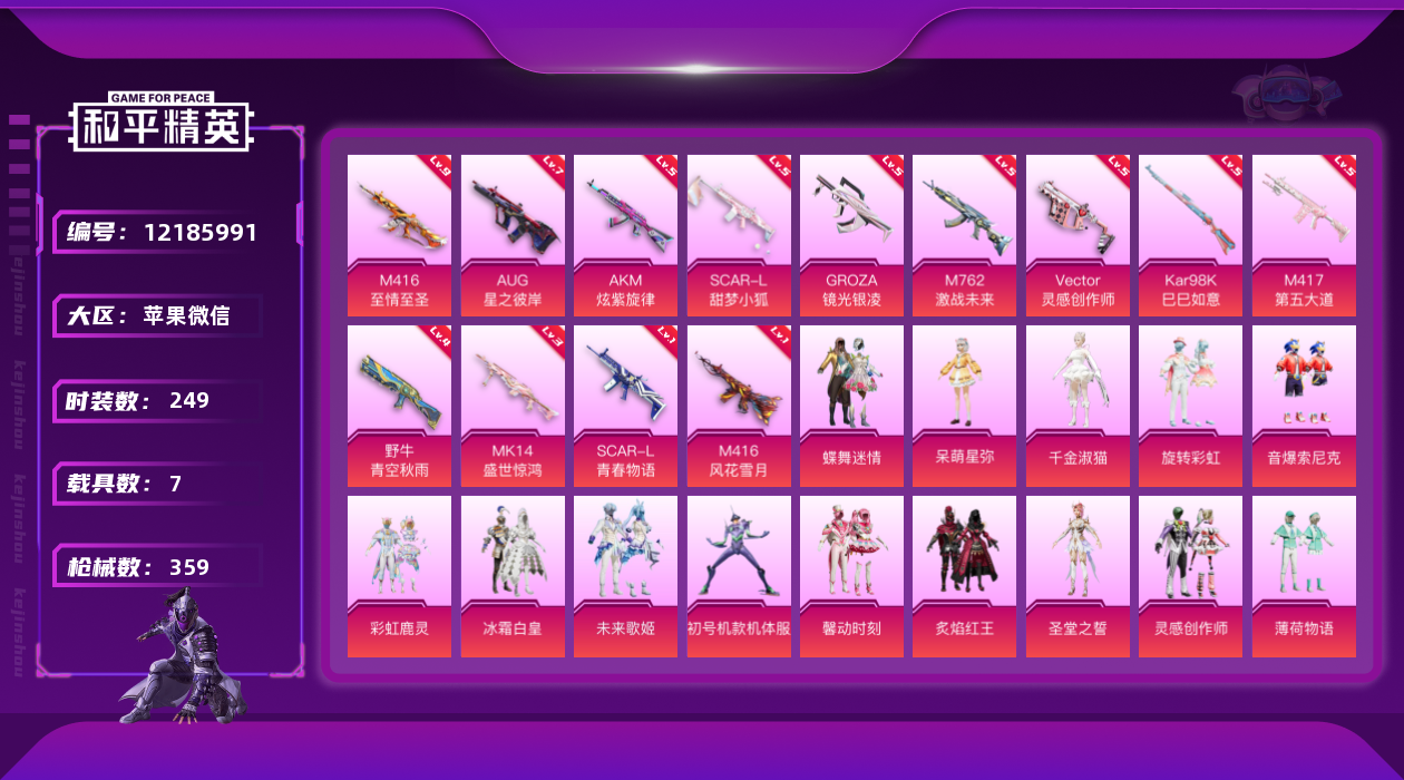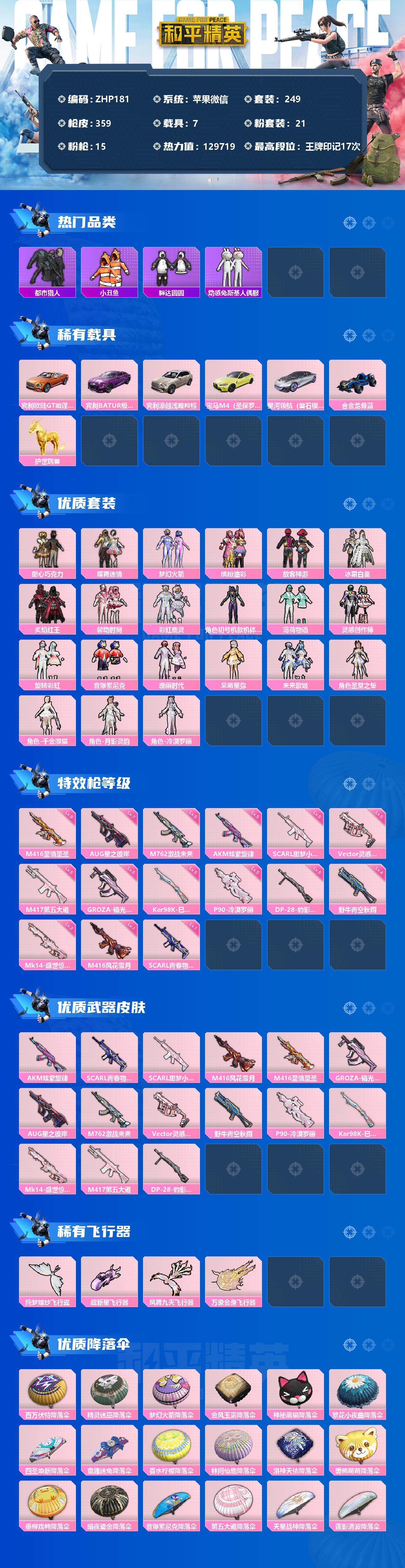 [12185991]身法素材【特价急出/详情看图】:九级M4至情!螳螂!都市!苹果 微信-21粉装-15特效枪-7载具-4粉色飞行器-129719热力值-17王牌印记-249套装-359枪皮