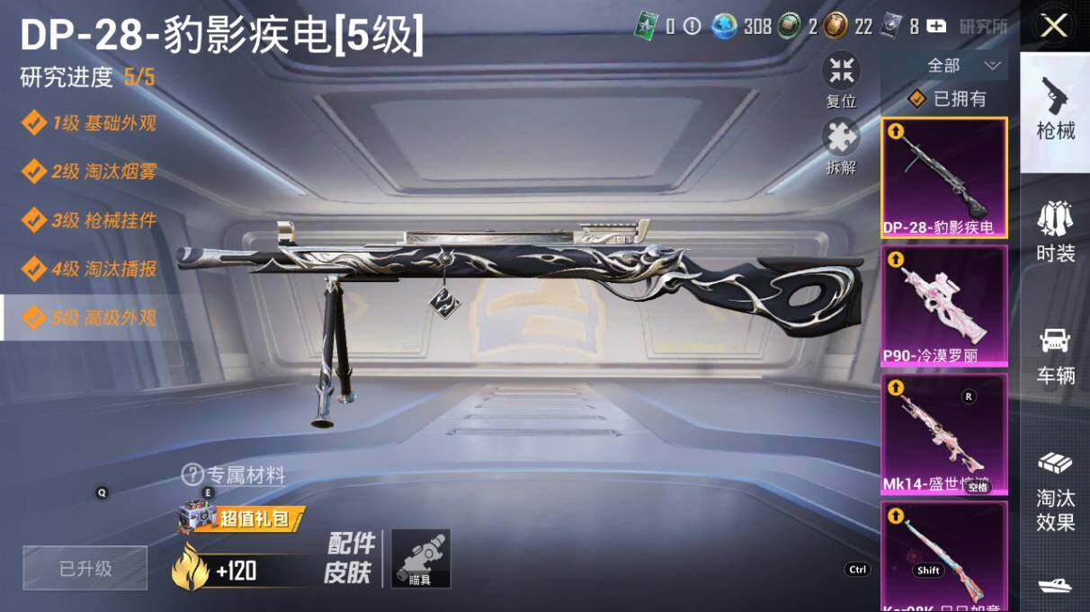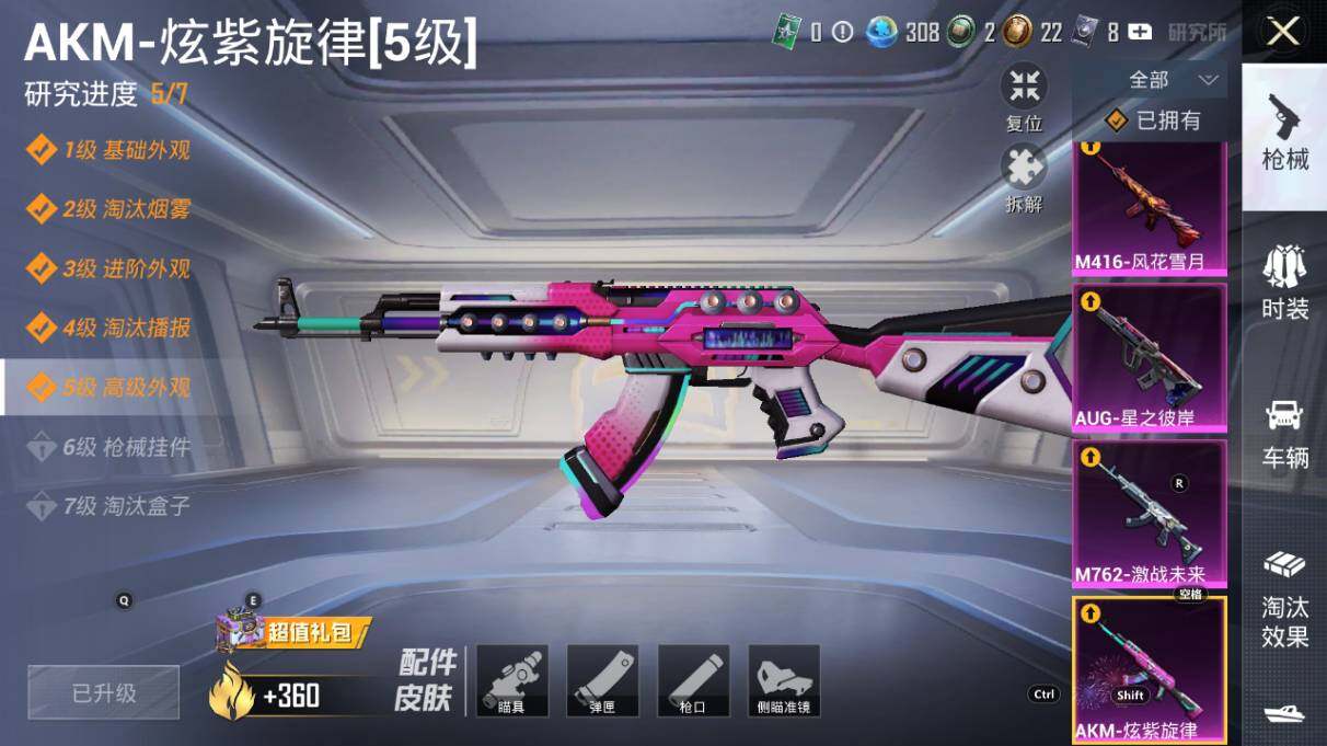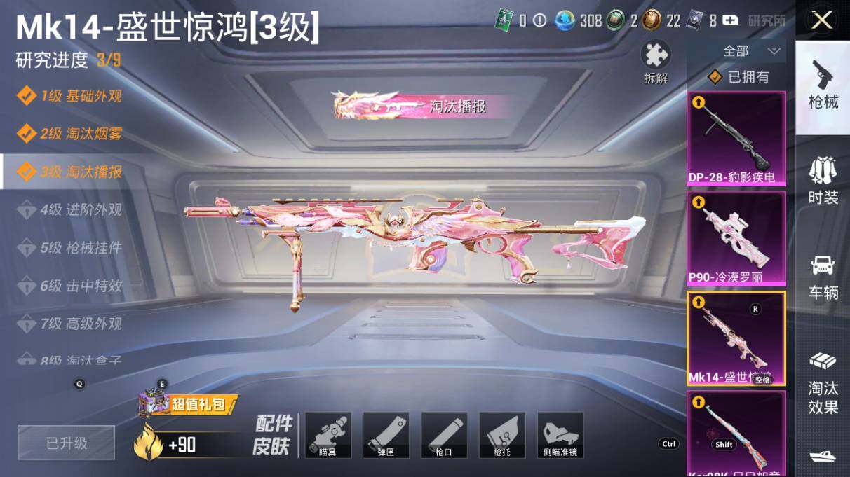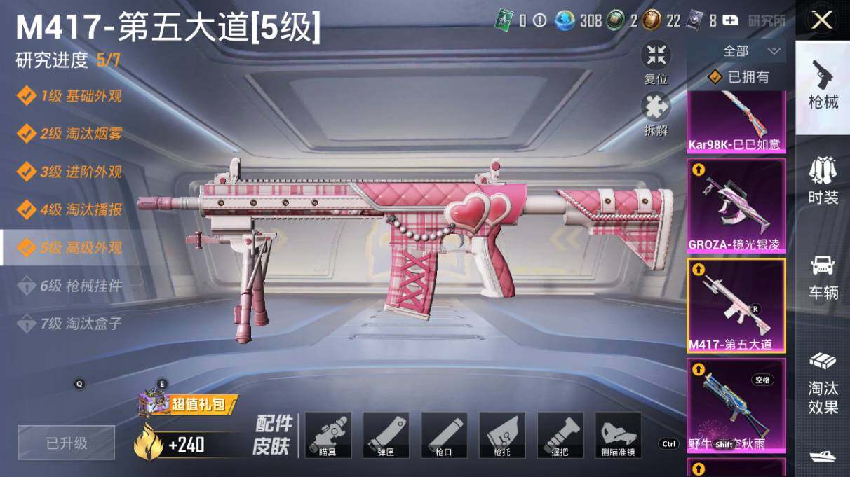【粉色枪皮等级】:AKM-炫紫旋律(五级),SCAR-L-青春物语(一级),SCAR-L-甜梦小狐(五级),M416-风花雪月(一级),M416-至情至圣(九级),GROZA-镜光银凌(五级),AUG-星之彼岸(七级),M762-激战未来(五级),Vector-灵感创作师(五级),野牛-青空秋雨(四级),P90-冷漠罗丽(五级),Kar98K-巳巳如意(五级),Mk14-盛世惊鸿(三级),M417-第五大道(五级),DP-28-豹影疾电(五级)