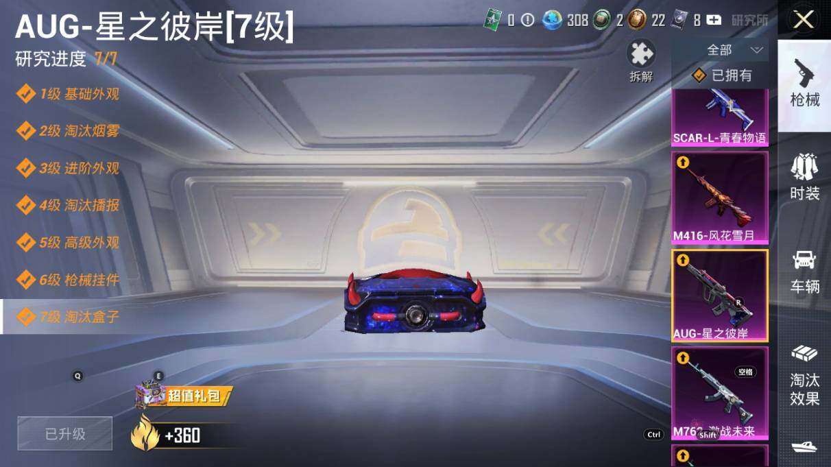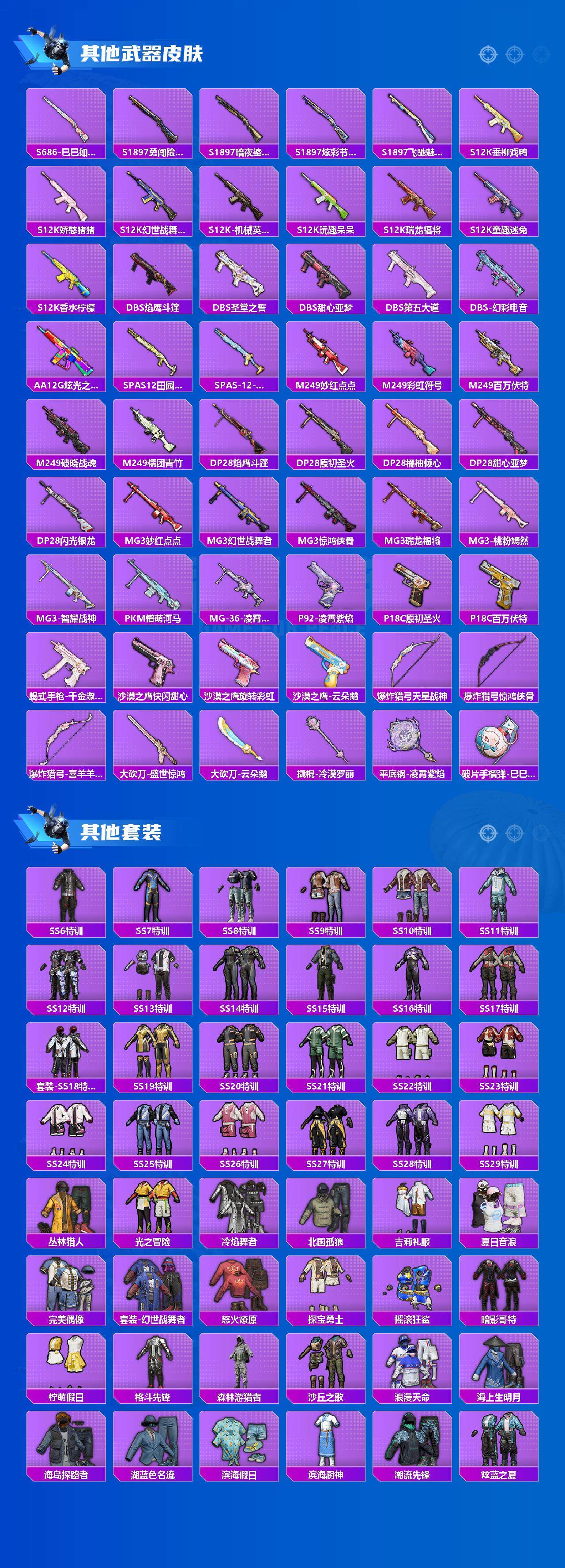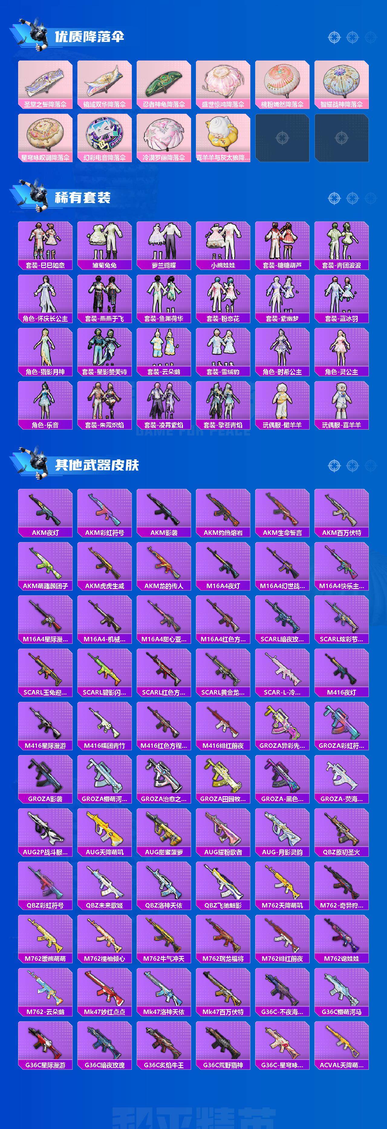 AKM-炫紫旋律,SCAR-L-青春物语,SCAR-L-甜梦小狐,M416-风花雪月,M416-至情至圣,GROZA-镜光银凌,AUG-星之彼岸,M762-激战未来,Vector-灵感创作师,野牛-青空秋雨,Kar98K-巳巳如意,Mk14-盛世惊鸿,M417-第五大道