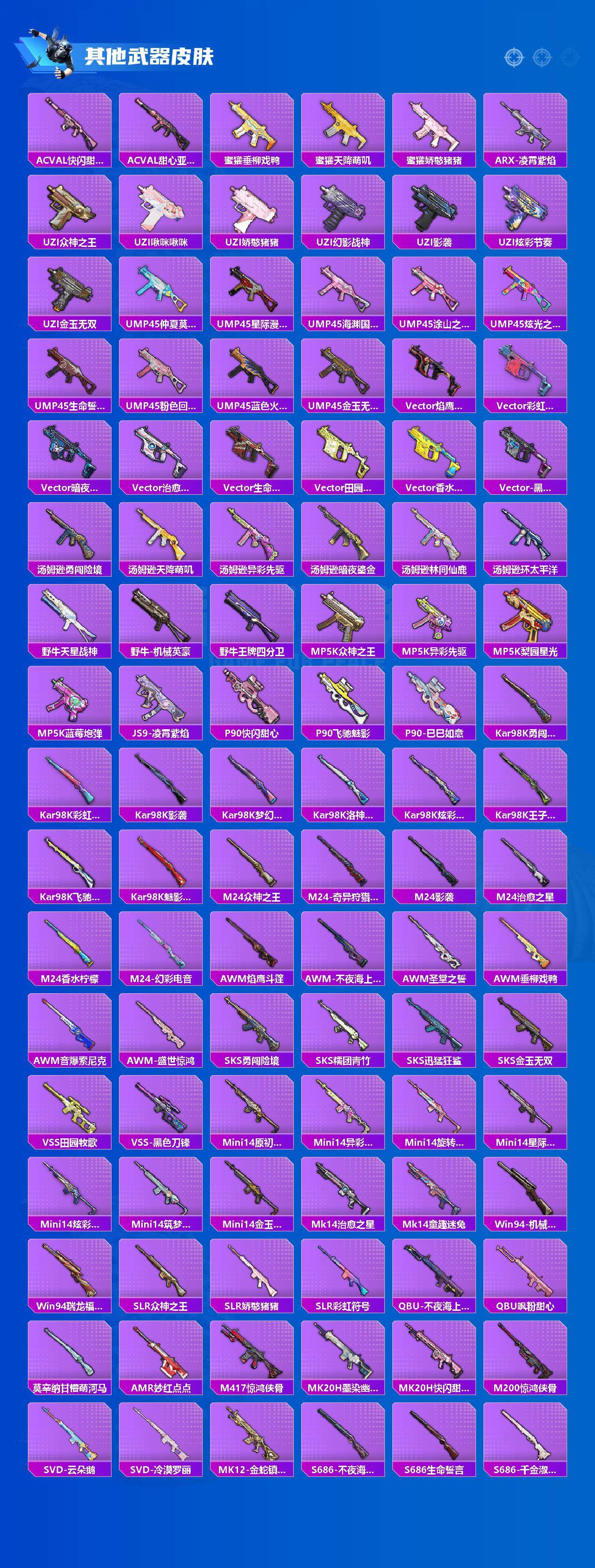 【粉色枪皮】:AKM-炫紫旋律,SCAR-L-青春物语,SCAR-L-甜梦小狐,M416-风花雪月,M416-至情至圣,GROZA-镜光银凌,AUG-星之彼岸,M762-激战未来,Vector-灵感创作师,野牛-青空秋雨,P90-冷漠罗丽,Kar98K-巳巳如意,Mk14-盛世惊鸿,M417-第五大道,DP-28-豹影疾电