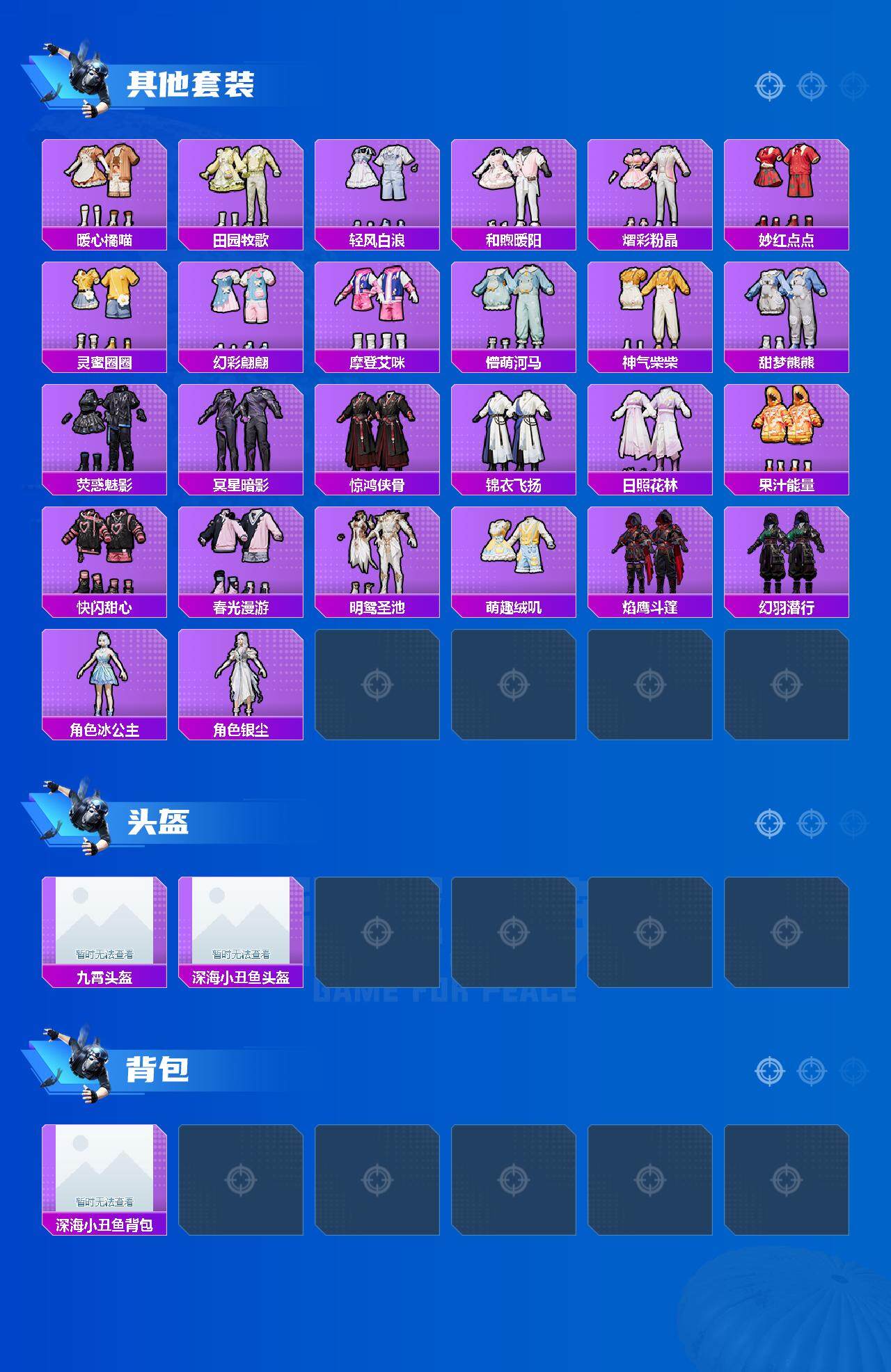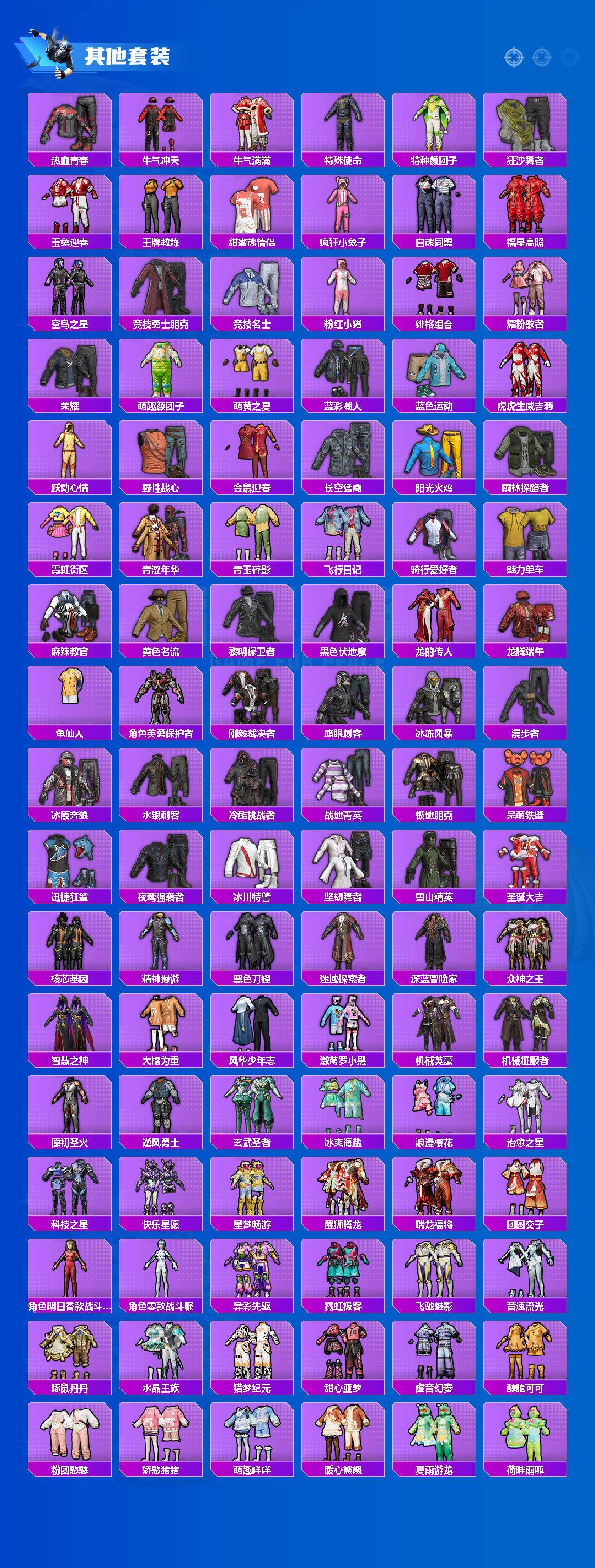 【粉色套装】:粉装-甜心巧克力,粉装-蝶舞迷情,粉装-梦幻火箭,粉装-缤纷油彩,粉装-放客神游,粉装-冰霜白皇,粉装-炙焰红王,粉装-馨动时刻,粉装-彩虹鹿灵,角色-初号机款机体服,粉装-薄荷物语,粉装-灵感创作师,粉装-旋转彩虹,粉装-音爆索尼克,粉装-瑰丽时代,角色-呆萌星弥,粉装-未来歌姬,角色-圣堂之誓,角色-千金淑猫,角色-月影灵韵,角色-冷漠罗丽