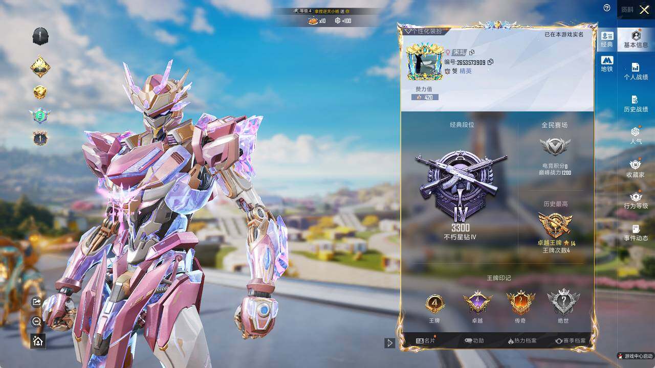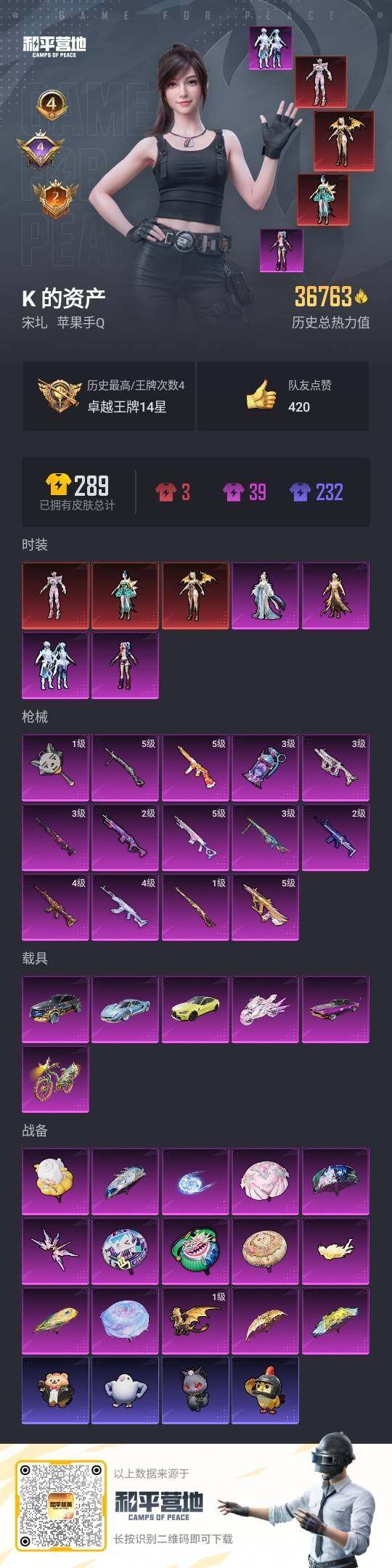 - [10717270]实名: 可修改 时装数: 669 枪械数: 199 战备数: 137 热门装扮: 鹰眼刺客,缤纷油彩,萌熊伴侣,暗夜玫瑰,星穹咏叹调 稀有枪皮: M416五爪金龙,Vector环太平洋,DP-28暗夜鎏金,Kar98K-巳巳如意,DP-28-豹影疾电