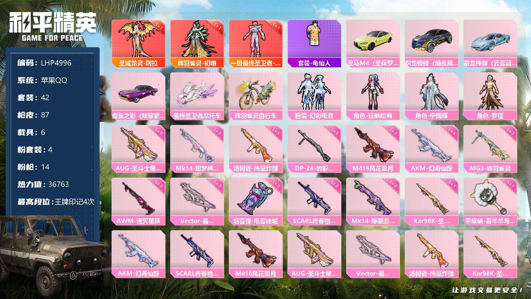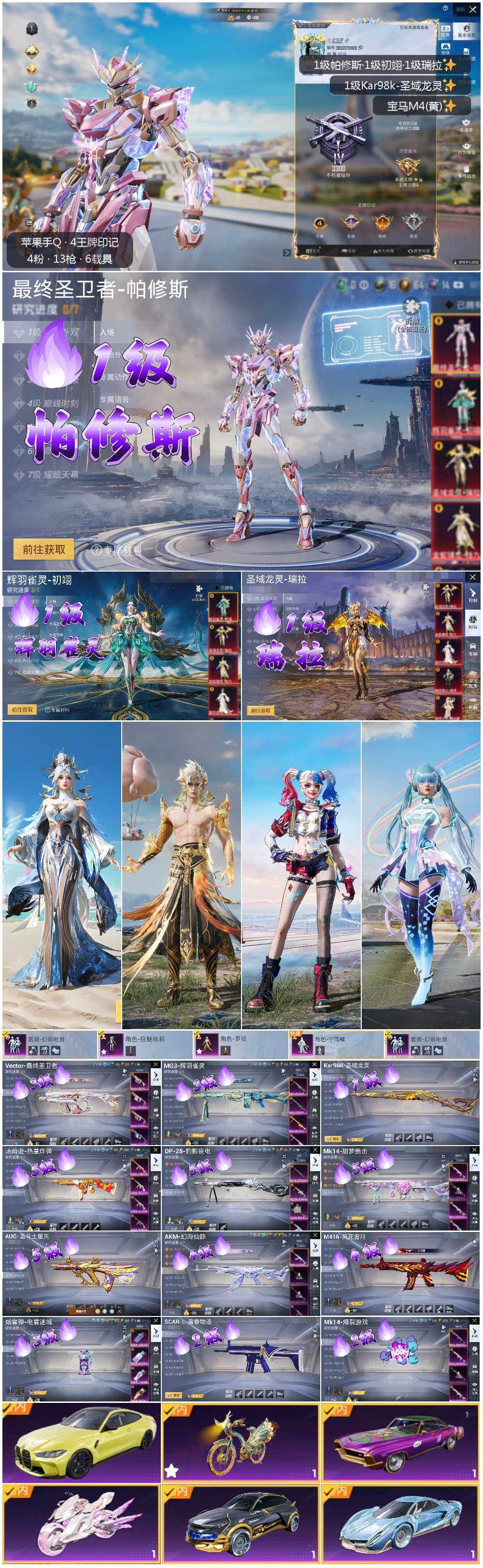 [12181746]素材身法号【特价急出/详情看图】:苹果 手Q-3神装-4粉装-14特效枪-6载具-4粉色飞行器-3.6w热力值-4王牌印记-42套装-87枪皮【红色神装等级】:最终圣卫者-帕修斯(一级),辉羽雀灵-初翊(一级),圣域龙灵-瑞拉(一级)【热门品类】:套装-龟仙人【粉色载具】:宝马M4(圣保罗黄),炽龙极锋(暗夜黑),霜龙神御(云雾蓝),虚妄之影(炫耀紫),最终圣卫者摩托车,辉羽雀灵自行车【粉色套装】:粉装-幻彩电音,角色-狂魅哈莉,角色-宁雨蝶,角色-罗征【粉色枪皮等级】:AKM-幻海仙踪(四级),SCAR-L-青春物语(二级),M416-风花雪月(四级),AUG-圣斗士星矢(五级),Vector-最终圣卫者(三级),汤姆逊-热量炸弹(五级),Kar98K-圣域龙灵(一级),AWM-湮灭星辰(三级),Mk14-甜梦熊击(五级),Mk14-爆裂游戏(二级),DP-28-豹影疾电(五级),MG3-辉羽雀灵(三级),平底锅-喜羊羊与灰太狼(一级),烟雾弹-电雾迷城(三级)【粉色飞行器】:圣域金龙飞行器,雀灵庇佑飞行器,终晖之翼飞行器,宁雨蝶飞行器