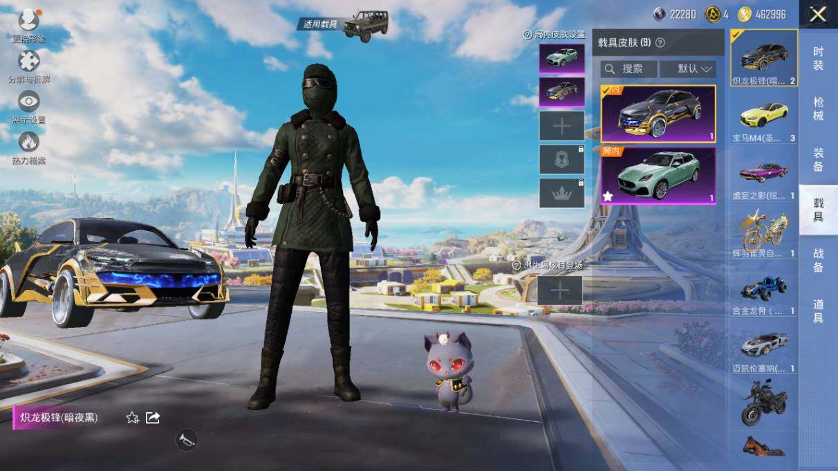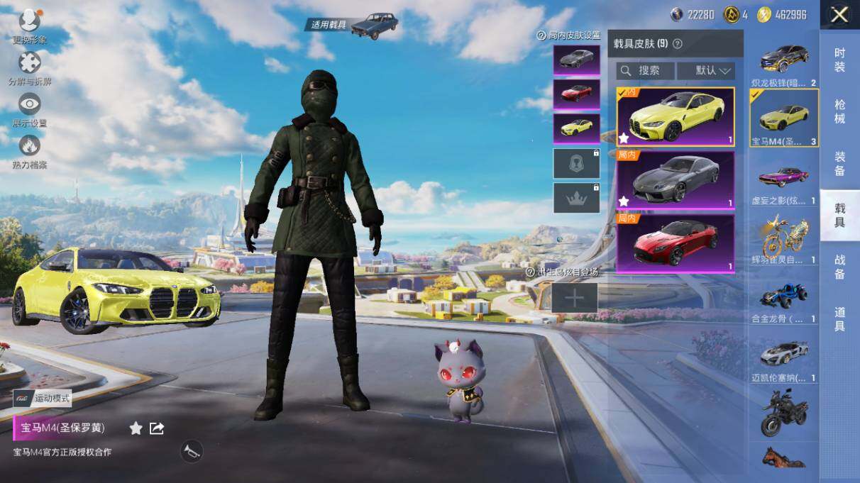 【粉色载具】:兰博基尼Estoque(银翼灰),阿斯顿马丁DBS(红),玛莎拉蒂Grecale(薄荷绿),宝马M4(圣保罗黄),迈凯伦塞纳(冷萃蓝),炽龙极锋(暗夜黑),虚妄之影(炫耀紫),合金龙骨(蓝),辉羽雀灵自行车
