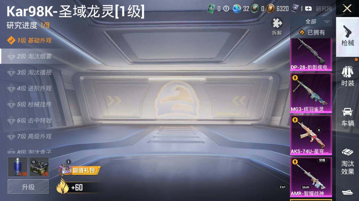 【粉色枪皮等级】:AKM-炫紫旋律(四级),M416-五爪金龙(七级),M416-风花雪月(三级),AKS-74U-星穹咏叹调(四级),Kar98K-巳巳如意(一级),Kar98K-圣域龙灵(一级),AMR-智耀战神(五级),MK12-雪月幻音(一级),DP-28-豹影疾电(五级),MG3-辉羽雀灵(三级)
