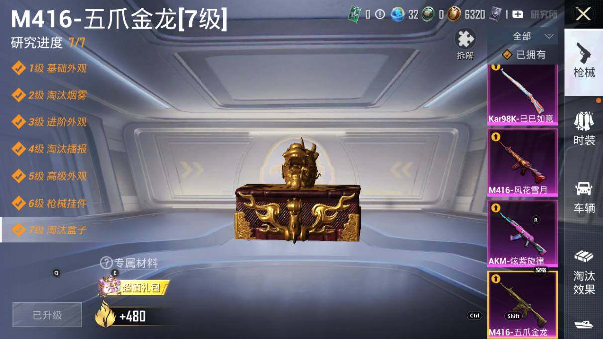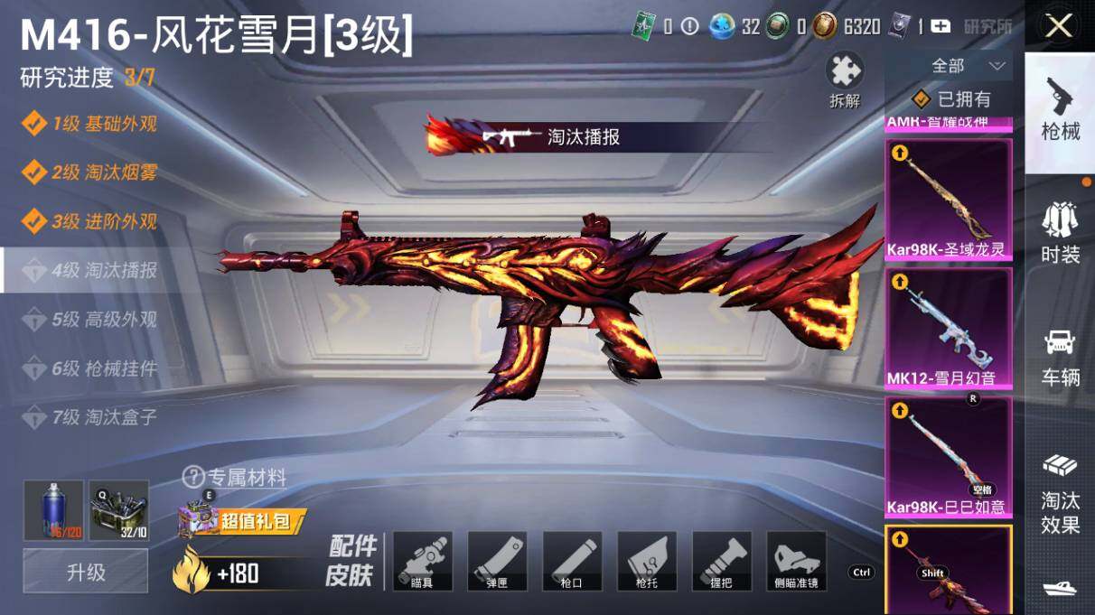 AKM-炫紫旋律,M416-五爪金龙,M416-风花雪月,Kar98K-巳巳如意,Kar98K-圣域龙灵,MK12-雪月幻音