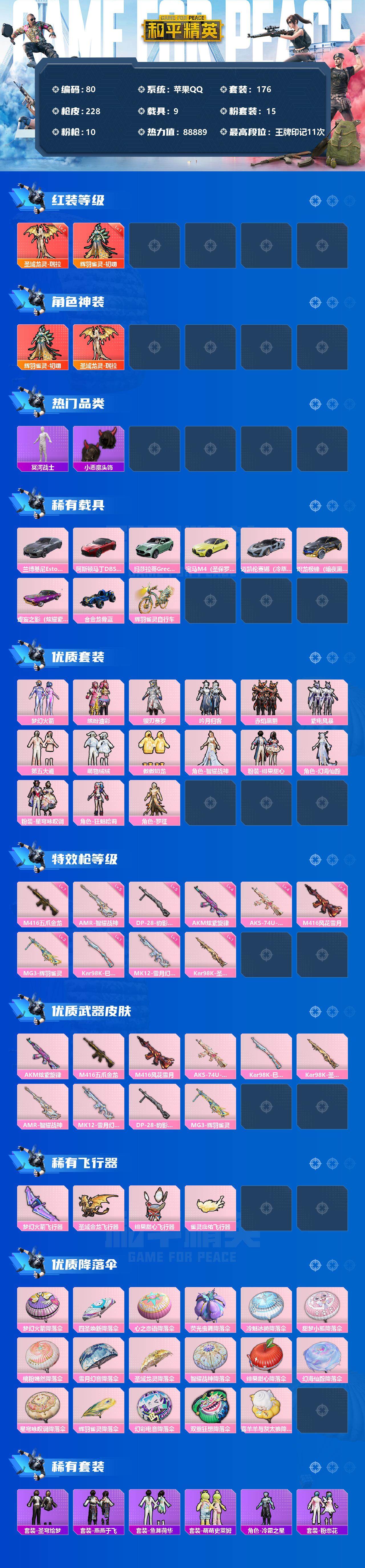 [12170980]身法素材号【特价急出/详情看图】有二次-苹果-2红装-15粉装-10特效枪-9载具-8.9w热力值-10印记-164套装-220枪皮