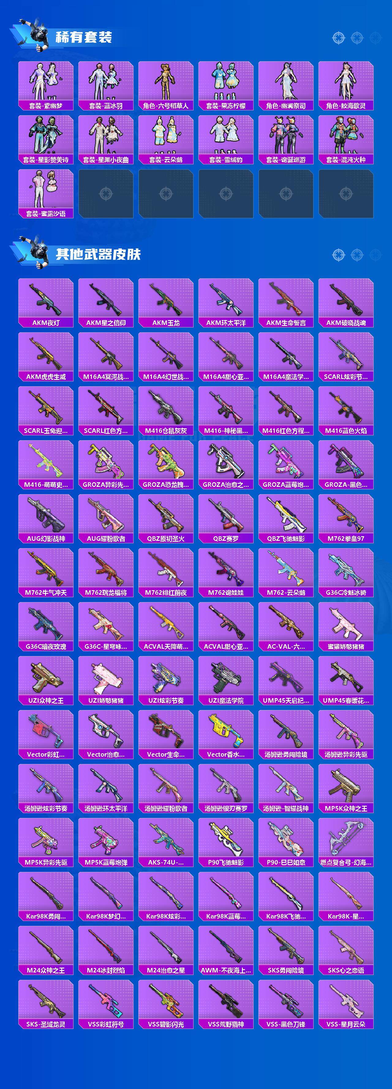 【粉色枪皮】:AKM-炫紫旋律,M416-五爪金龙,M416-风花雪月,AKS-74U-星穹咏叹调,Kar98K-巳巳如意,Kar98K-圣域龙灵,AMR-智耀战神,MK12-雪月幻音,DP-28-豹影疾电,MG3-辉羽雀灵