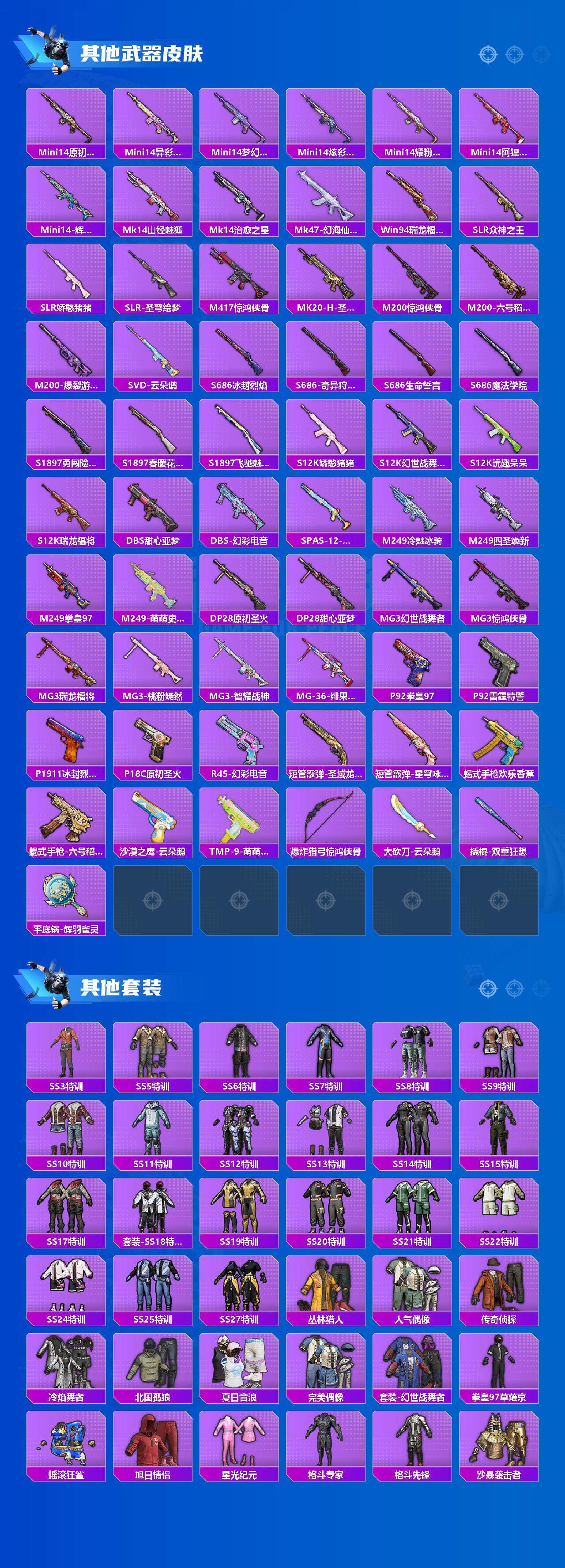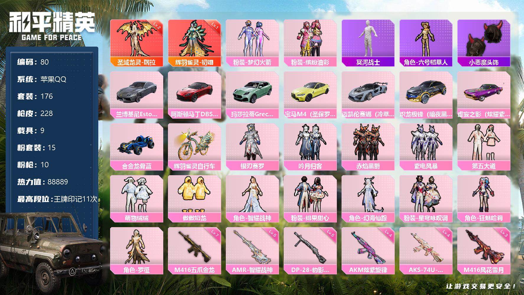 [12170980]身法素材号【特价急出/详情看图】有二次-苹果-2红装-15粉装-10特效枪-9载具-8.9w热力值-10印记-164套装-220枪皮 【红色神装等级】:辉羽雀灵-初翊(一级),圣域龙灵-瑞拉(二级) 【热门品类】:粉装-梦幻火箭,粉装-缤纷油彩,套装-冥河战士,角色-六号稻草人,小恶魔头饰 【粉色载具】:兰博基尼Estoque(银翼灰),阿斯顿马丁DBS(红),玛莎拉蒂Grecale(薄荷绿),宝马M4(圣保罗黄),迈凯伦塞纳(冷萃蓝),炽龙极锋(暗夜黑),虚妄之影(炫耀紫),合金龙骨(蓝),辉羽雀灵自行车 【粉色套装】:粉装-梦幻火箭,粉装-缤纷油彩,粉装-银刃赛罗,粉装-吟月归客,粉装-赤焰黑爵,粉装-紫电风暴,粉装-第五大道,粉装-萌物绒绒,粉装-傲傲奶龙,角色-智耀战神,粉装-绯果甜心,角色-幻海仙踪,粉装-星穹咏叹调,角色-狂魅哈莉,角色-罗征 【粉色枪皮等级】:AKM-炫紫旋律(四级),M416-五爪金龙(七级),M416-风花雪月(三级),AKS-74U-星穹咏叹调(四级),Kar98K-巳巳如意(一级),Kar98K-圣域龙灵(一级),AMR-智耀战神(五级),MK12-雪月幻音(一级),DP-28-豹影疾电(五级),MG3-辉羽雀灵(三级) 【粉色枪皮】:AKM-炫紫旋律,M416-五爪金龙,M416-风花雪月,AKS-74U-星穹咏叹调,Kar98K-巳巳如意,Kar98K-圣域龙灵,AMR-智耀战神,MK12-雪月幻音,DP-28-豹影疾电,MG3-辉羽雀灵 【粉色飞行器】:梦幻火箭飞行器,圣域金龙飞行器,绯果甜心飞行器,雀灵庇佑飞行器 【粉色降落伞】:梦幻火箭降落伞,四圣焕新降落伞,心之恋语降落伞,荧光虫舞降落伞,冷魅冰骑降落伞,甜梦小狐降落伞,桃粉嫣然降落伞,雪月幻音降落伞,圣域龙灵降落伞,智耀战神降落伞,绯果甜心降落伞,幻海仙踪降落伞,星穹咏叹调降落伞,辉羽雀灵降落伞,幻彩电音降落伞,双重狂想降落伞,喜羊羊与灰太狼降落伞 【稀有套装】:套装-圣穹绘梦,套装-燕燕于飞,套装-鱼渊荷华,套装-萌萌史莱姆,角色-冷霜之星,套装-粉恋花,套装-紫幽梦,套装-蓝冰羽,角色-六号稻草人,套装-果冻柠檬,角色-幽澜祭司,角色-鲛海歌灵,套装-星影赞美诗,套装-星渊小夜曲,套装-云朵鹅,套装-雪绒豹,套装-诡诞巡游,套装-混沌火种,套装-蜜露汐语 【稀