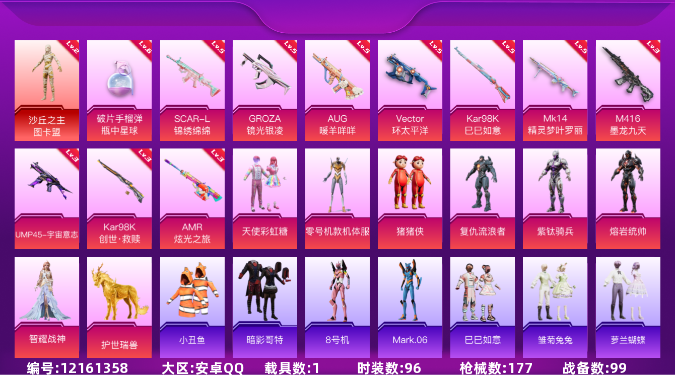 [12161358]素材身法号/地铁满天赋【特价急出/详情看图】:安卓 手Q-2神装-9粉装-13特效枪-1载具-7粉色飞行器-5.9w热力值-3王牌印记-96套装-177枪皮【红色神装等级】:魔童闹海-哪吒(二级),沙丘之主-图卡盟(二级)【热门品类】:粉装-梦幻火箭,套装-深海小丑鱼,套装-小丑鱼,角色-军刀雅典娜,套装-AG战队服,套装-龟仙人,套装-暗影哥特,角色-8号机,角色-Mark.06【粉色载具】:护世瑞兽【粉色套装】:粉装-天使彩虹糖,粉装-梦幻火箭,角色-零号机款机体服,角色-复仇流浪者,角色-熔岩统帅,角色-紫钛骑兵,玩偶服-猪猪侠,角色-智耀战神,角色-异瞳寒姬【粉色枪皮等级】:SCAR-L-锦绣绵绵(五级),M416-墨龙九天(三级),GROZA-镜光银凌(五级),AUG-暖羊咩咩(五级),UMP45-宇宙意志(三级),Vector-环太平洋(五级),汤姆逊-热量炸弹(四级),Kar98K-创世·救赎(三级),Kar98K-巳巳如意(五级),Mk14-精灵梦叶罗丽(五级),AMR-炫光之旅(三级),DP-28-豹影疾电(五级),破片手榴弹-瓶中星球(六级)【粉色飞行器】:沙丘之主天马,龙翔九天飞行器,深渊漩涡飞行器,万象金身飞行器,灵猫魔法师飞行器,飞天猪飞行器