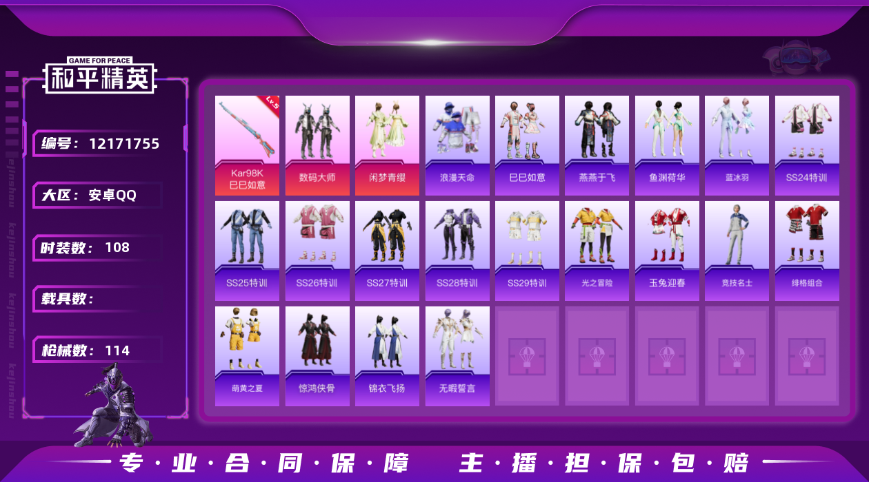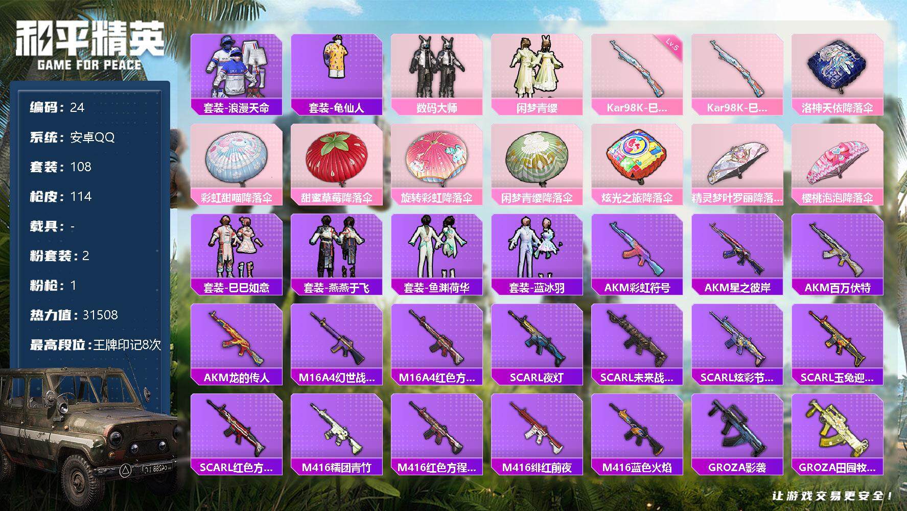 [12171755]MQ704安卓 手Q-2粉装-1特效枪-0载具-0粉色飞行器-31508热力值-8王牌印记-108套装-114枪皮