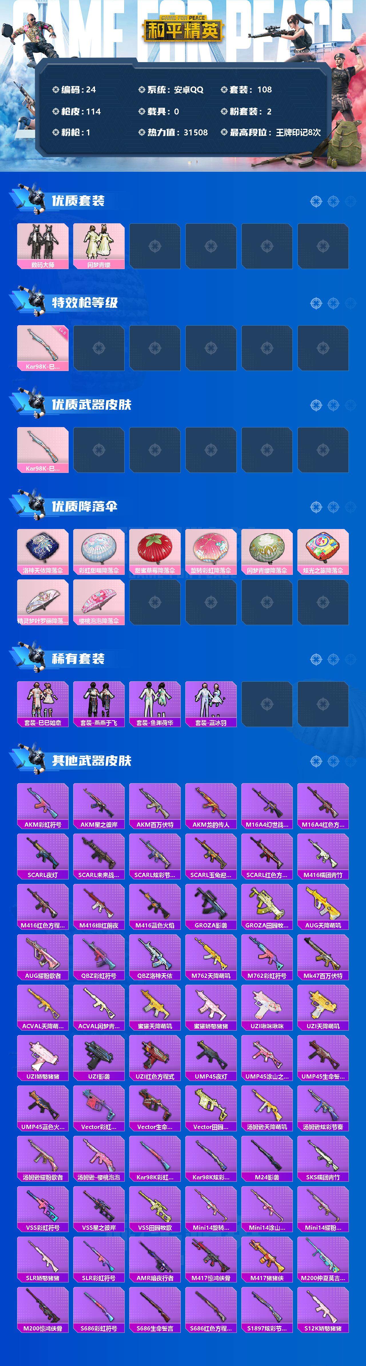 [12171755]MQ704安卓 手Q-2粉装-1特效枪-0载具-0粉色飞行器-31508热力值-8王牌印记-108套装-114枪皮 【热门品类】:套装-浪漫天命,套装-龟仙人 【粉色套装】:粉装-数码大师,粉装-闲梦青缨 【粉色枪皮等级】:Kar98K-巳巳如意(五级) 【粉色枪皮】:Kar98K-巳巳如意 【粉色降落伞】:洛神天依降落伞,彩虹甜喵降落伞,甜蜜草莓降落伞,旋转彩虹降落伞,闲梦青缨降落伞,炫光之旅降落伞,精灵梦叶罗丽降落伞,樱桃泡泡降落伞 【稀有套装】:套装-龟仙人,套装-巳巳如意,套装-燕燕于飞,套装-鱼渊荷华,套装-蓝冰羽 【稀有枪皮】:AKM-彩虹符号,AKM-星之彼岸,AKM-百万伏特,AKM-龙的传人,M16A4-幻世战舞者,M16A4-红色方程式,SCAR-L-夜灯,SCAR-L-未来战士,SCAR-L-炫彩节奏,SCAR-L-玉兔迎春,SCAR-L-红色方程式,M416-糯团青竹,M416-红色方程式,M416-绯红前夜,M416-蓝色火焰,GROZA-影袭,GROZA-田园牧歌,AUG-天降萌叽,AUG-耀粉歌者,QBZ-彩虹符号,QBZ-洛神天依,M762-天降萌叽,M762-彩虹符号,Mk47-百万伏特,AC-VAL-天降萌叽,AC-VAL-闲梦青缨,蜜獾-天降萌叽,蜜獾-娇憨猪猪,UZI-啾咪啾咪,UZI-天降萌叽,UZI-娇憨猪猪,UZI-影袭,UZI-红色方程式,UMP45-夜灯,UMP45-涂山之恋,UMP45-生命誓言,UMP45-蓝色火焰,Vector-彩虹符号,Vector-生命誓言,Vector-田园牧歌,汤姆逊-天降萌叽,汤姆逊-炫彩节奏,汤姆逊-耀粉歌者,汤姆逊-樱桃泡泡,Kar98K-彩虹符号,Kar98K-炫彩节奏,M24-影袭,SKS-糯团青竹,VSS-彩虹符号,VSS-星之彼岸,VSS-田园牧歌,Mini14-旋转彩虹,Mini14-涂山之恋,Mini14-耀粉歌者,SLR-娇憨猪猪,SLR-彩虹符号,AMR-暗夜行者,M417-惊鸿侠骨,M417-猪猪侠,M200-仲夏莫吉托,M200-惊鸿侠骨,S686-彩虹符号,S686-生命誓言,S686-红色方程式,S1897-炫彩节奏,S12K-玩趣呆呆,S12K-娇憨猪猪,S12K-幻世战舞者,DBS-彩虹符号,SPAS-12-田园牧歌,M249-彩虹符号,M249-糯团