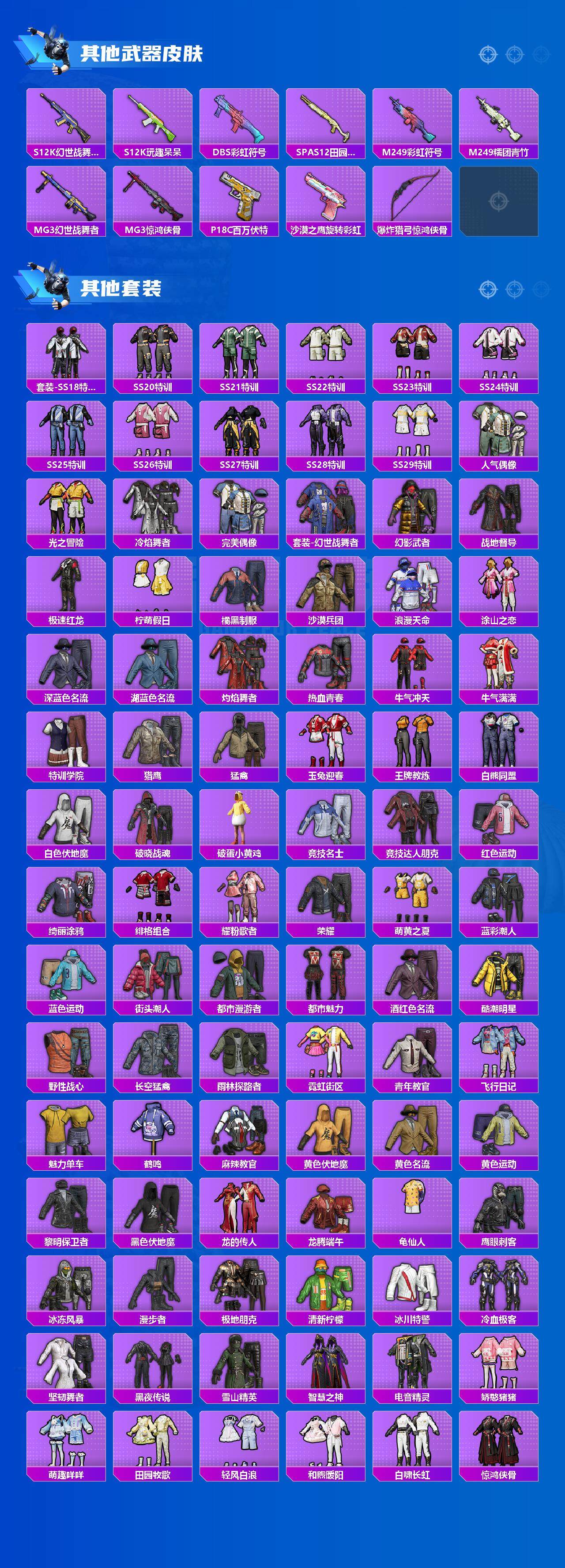 【稀有枪皮】:AKM-彩虹符号,AKM-星之彼岸,AKM-百万伏特,AKM-龙的传人,M16A4-幻世战舞者,M16A4-红色方程式,SCAR-L-夜灯,SCAR-L-未来战士,SCAR-L-炫彩节奏,SCAR-L-玉兔迎春,SCAR-L-红色方程式,M416-糯团青竹,M416-红色方程式,M416-绯红前夜,M416-蓝色火焰,GROZA-影袭,GROZA-田园牧歌,AUG-天降萌叽,AUG-耀粉歌者,QBZ-彩虹符号,QBZ-洛神天依,M762-天降萌叽,M762-彩虹符号,Mk47-百万伏特,AC-VAL-天降萌叽,AC-VAL-闲梦青缨,蜜獾-天降萌叽,蜜獾-娇憨猪猪,UZI-啾咪啾咪,UZI-天降萌叽,UZI-娇憨猪猪,UZI-影袭,UZI-红色方程式,UMP45-夜灯,UMP45-涂山之恋,UMP45-生命誓言,UMP45-蓝色火焰,Vector-彩虹符号,Vector-生命誓言,Vector-田园牧歌,汤姆逊-天降萌叽,汤姆逊-炫彩节奏,汤姆逊-耀粉歌者,汤姆逊-樱桃泡泡,Kar98K-彩虹符号,Kar98K-炫彩节奏,M24-影袭,SKS-糯团青竹,VSS-彩虹符号,VSS-星之彼岸,VSS-田园牧歌,Mini14-旋转彩虹,Mini14-涂山之恋,Mini14-耀粉歌者,SLR-娇憨猪猪,SLR-彩虹符号,AMR-暗夜行者,M417-惊鸿侠骨,M417-猪猪侠,M200-仲夏莫吉托,M200-惊鸿侠骨,S686-彩虹符号,S686-生命誓言,S686-红色方程式,S1897-炫彩节奏,S12K-玩趣呆呆,S12K-娇憨猪猪,S12K-幻世战舞者,DBS-彩虹符号,SPAS-12-田园牧歌,M249-彩虹符号,M249-糯团