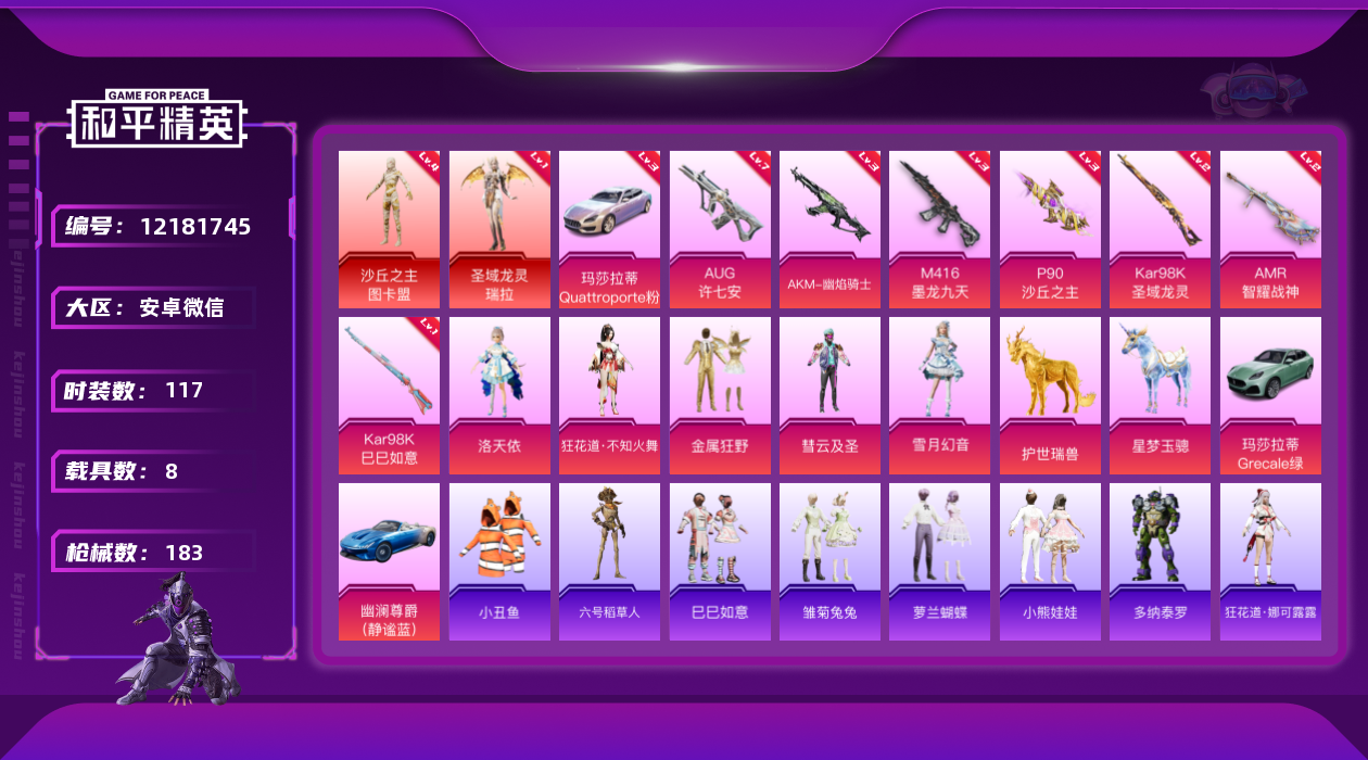 - [12135122]2粉装 5特效枪 4印记 可二次 可修改实名 优质装备:AUG星之彼岸,七级AUG-星之彼岸,雪月幻音,AMR-智耀战神,Vector-最终圣卫者,绯穹魔姬,Kar98K-巳巳如意 稀有枪皮:DP-28-豹影疾电 六级特效枪:六级AMR-智耀战神 五级特效枪:五级Kar98K-巳巳如意,五级DP-28-豹影疾电 三级特效枪:三级Vector-最终圣卫者 紫色装扮:SS23特训,SS31特训套装,冷焰舞者,霓虹热舞,SS30特训套装,云朵鹅,彩虹兔,雪绒豹,SS33特训套装,青涩时光,时希公主,爆裂葡萄,银白舞王,暖风夏荷,英勇保护者,甜心亚梦,虚音幻奏,都市漫游者,酷潮明星,荣耀,蓝海鲸歌,魅力单车,鹤鸣,黄色伏地魔,黎明保卫者,黑色伏地魔,龙的传人,龟仙人,香桃花海,柠萌假日,海岛探路者,涂山之恋,幻影武者,幻世战舞者,探宝勇士,绮丽涂鸦,白色伏地魔,破晓战魂,破蛋小黄鸡,红色运动,王牌教练,灼焰舞者,牛气满满,猛禽,特殊使命,特训学院,SS29特训,星途旅人,鱼渊荷华,玉兔迎春,燕燕于飞,巳巳如意,都市丽猫,青团波波,糖糖葫芦,棉花软糖,竞技名士,街头风暴,惊鸿侠骨,甜梦熊熊,神气柴柴,懵萌河马,SS24特训(SS24特训套装),SS25特训,锦衣飞扬,粉红小猪,蝶吟花词,智谋强哥,精神漫游,核芯基因,大橘大利,原初圣火,逆风勇士,耀粉歌者,深海来使,粉恋花,蓝冰羽,紫幽梦,SS32特训服(SS32特训套装),绯格组合,恋语绒绒,金耀舞者 优质战备:星途旅人降落伞,千金淑猫降落伞,绝色倾城飞行器,绯果甜心降落伞,终晖之翼飞行器,绯穹魔姬降落伞,荧海星豚降落伞,圣域龙灵降落伞,圣域金龙飞行器,樱桃泡泡降落伞,荒漠赏金降落伞,未来歌姬降落伞,飒粉甜心降落伞,四圣焕新降落伞