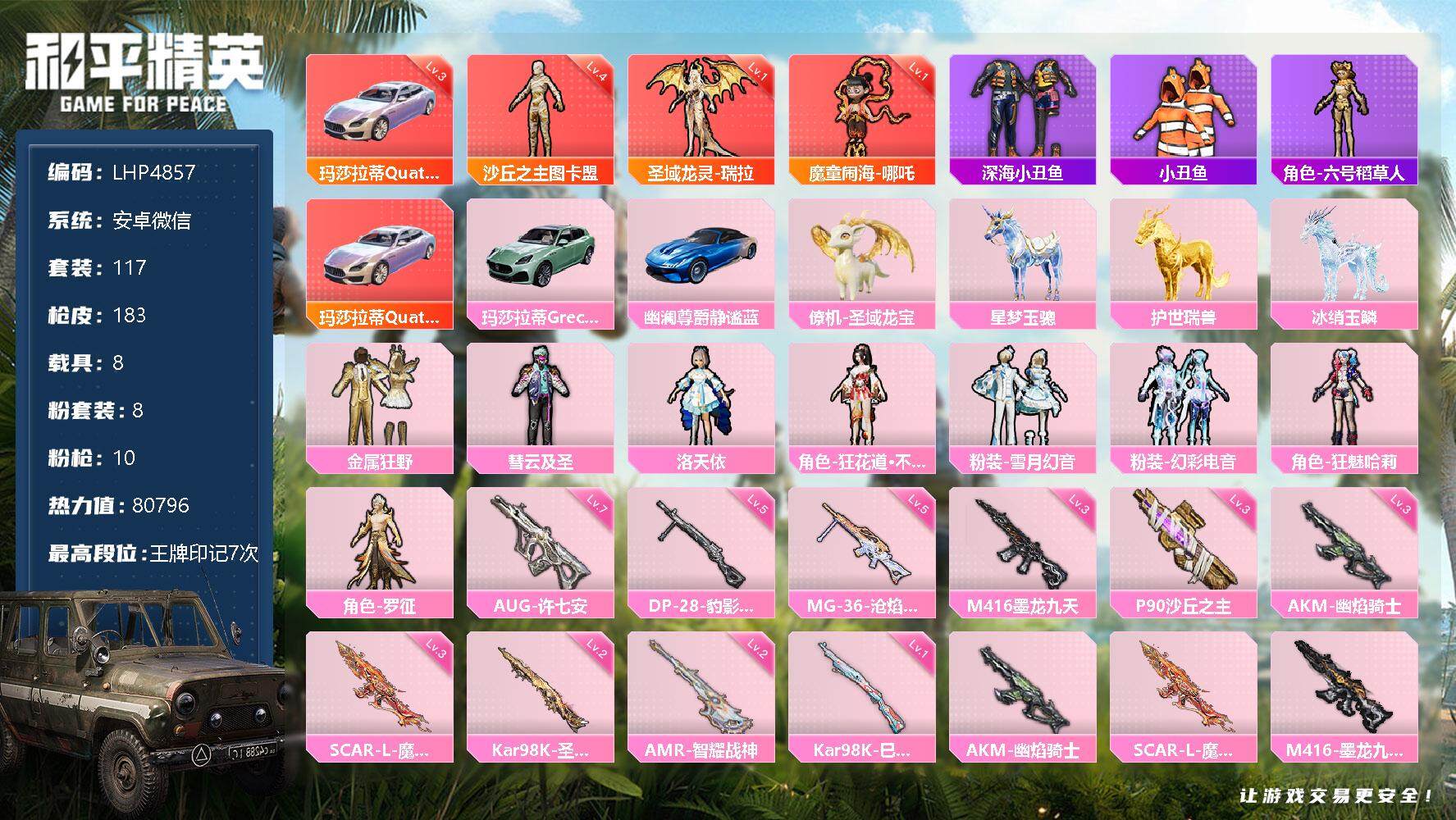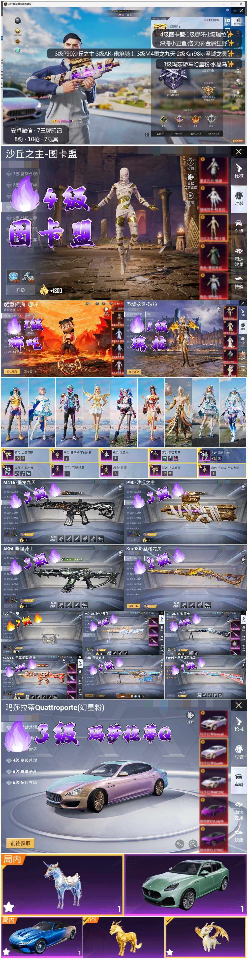 [12181745]素材身法号/沙丘之主-图卡盟(四级)【特价急出/详情看图】:安卓 微信-3神装-8粉装-10特效枪-8载具-13粉色飞行器-8w热力值-7王牌印记-117套装-183枪皮【红色载具】:玛莎拉蒂Quattroporte(幻星粉)(三级)【红色神装等级】:魔童闹海-哪吒(一级),圣域龙灵-瑞拉(一级),沙丘之主-图卡盟(四级)【热门品类】:套装-深海小丑鱼,套装-小丑鱼,角色-六号稻草人【粉色载具】:玛莎拉蒂Quattroporte(幻星粉),玛莎拉蒂Grecale(薄荷绿),幽澜尊爵(静谧蓝),僚机-圣域龙宝,星梦玉骢,护世瑞兽,冰绡玉鳞【粉色套装】:粉装-金属狂野,粉装-彗云及圣,角色-洛天依,角色-狂花道·不知火舞,粉装-雪月幻音,粉装-幻彩电音,角色-狂魅哈莉,角色-罗征【粉色枪皮等级】:AKM-幽焰骑士(三级),SCAR-L-魔童闹海 哪吒(三级),M416-墨龙九天(三级),AUG-许七安(七级),P90-沙丘之主(三级),Kar98K-巳巳如意(一级),Kar98K-圣域龙灵(二级),AMR-智耀战神(二级),DP-28-豹影疾电(五级),MG-36-沧焰双生(五级)【粉色飞行器】:酣梦熊熊飞行器,炫紫旋律飞行器,沙丘之主天马,镜域双华-灵镜之阶,龙翔九天飞行器,星梦奇缘飞行器,幽焰列车飞行器,万象金身飞行器,圣域金龙飞行器,雀灵庇佑飞行器,飞天猪飞行器,灵珠游龙飞行器