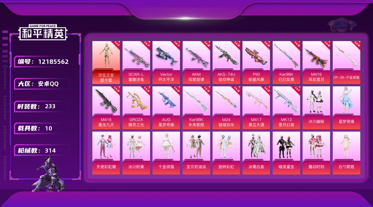 - PX_2103289- 安卓手Q-15王牌印记-14粉装-13特效枪-5载具-热力值-226套装-291枪皮-2卓越印记-0传奇印记 【14粉装】,第五大道,恐龙拽拽,木曜青龙,黄族统领,复仇流浪者,星云暗核,薄荷物语,海盐物语,樱桃泡泡,朗月武圣,冰霜白皇,炙焰红王,翡翠骑士,数码大师 【13特效枪】AKM-炫紫旋律-3级 AKM-绿萝繁花-5级 AKM-星际浪客-7级 SCAR-L-童趣迷兔-