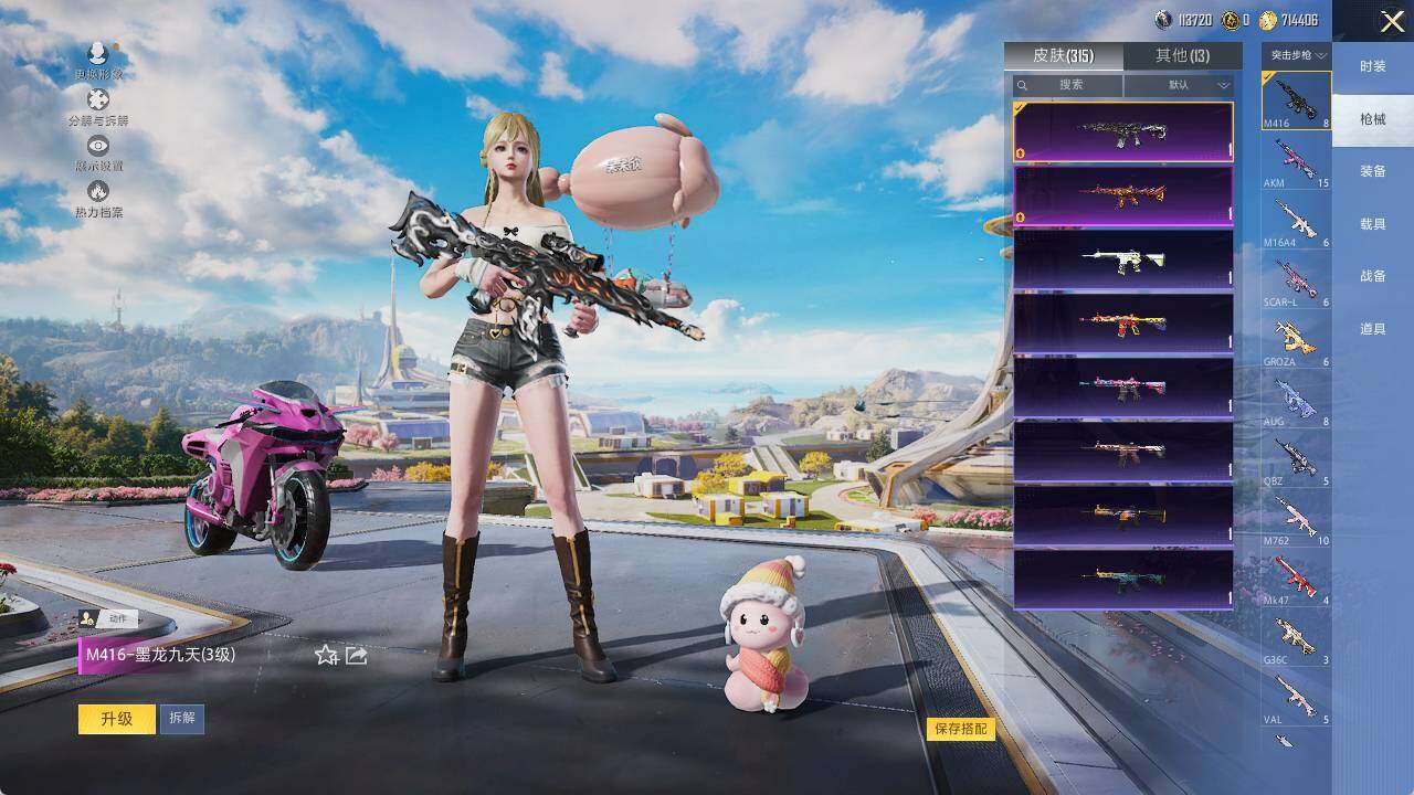 AKM-炫紫旋律,SCAR-L-童趣迷兔,M416-风花雪月,M416-墨龙九天,GROZA-精灵之光,AUG-星梦奇缘,Vector-环太平洋,AKS-74U-信仰神谕,P90-能量风暴,Kar98K-未来歌姬,Kar98K-巳巳如意,M24-镜域双华,M417-第五大道,MK12-雪月幻音,DP-28-千金淑猫