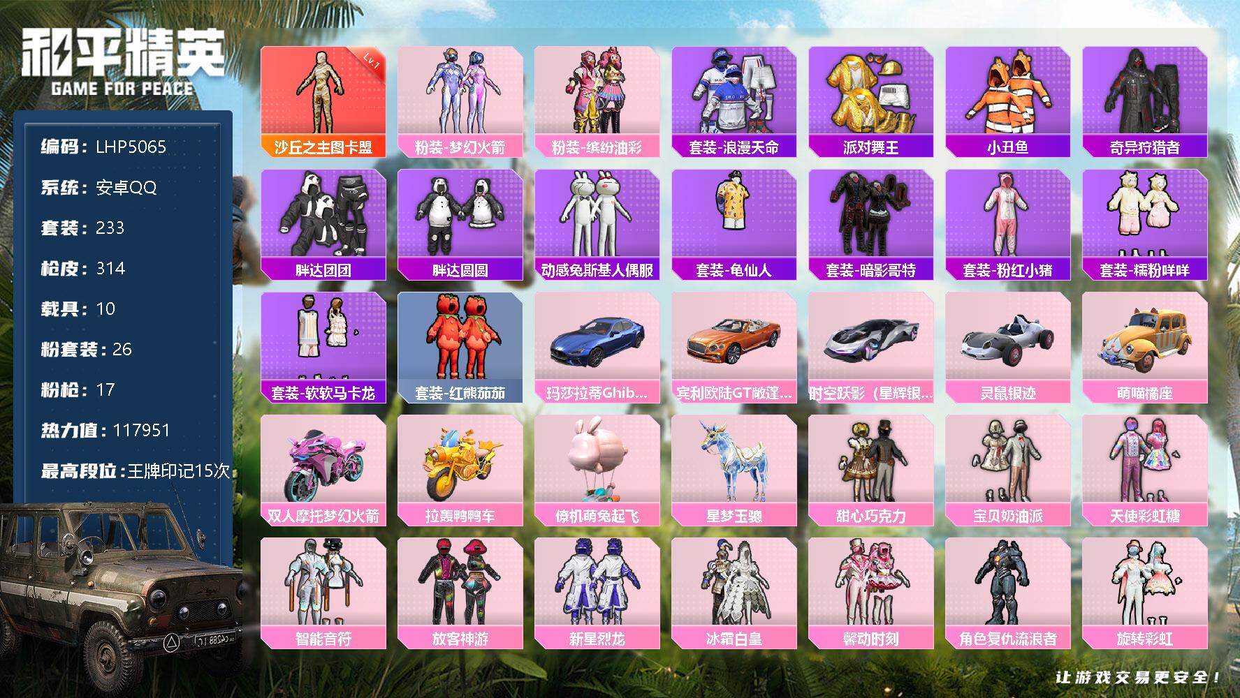 [12185562]女公主素材身法号/地铁满天赋【特价急出/详情看图】:安卓 手Q-1神装-26粉装-17特效枪-10载具-12粉色飞行器-11.7w热力值-15王牌印记-233套装-314枪皮【红色神装等级】:沙丘之主-图卡盟(一级)【热门品类】:粉装-梦幻火箭,粉装-缤纷油彩,套装-浪漫天命,套装-派对舞王,套装-小丑鱼,套装-奇异狩猎者,套装-胖达团团,套装-胖达圆圆,套装-动感兔斯基人偶服,套装-龟仙人,套装-暗影哥特,套装-粉红小猪,套装-糯粉咩咩,套装-软软马卡龙,套装-红熊茄茄【粉色载具】:玛莎拉蒂Ghibli(蓝),宾利欧陆GT敞篷(火焰橘),时空跃影(星辉银),灵鼠银迹,萌喵橘座,双人摩托-梦幻火箭,拉轰鸭鸭车,僚机-萌兔起飞,星梦玉骢【粉色套装】:粉装-甜心巧克力,粉装-宝贝奶油派,粉装-天使彩虹糖,粉装-梦幻火箭,粉装-智能音符,粉装-缤纷油彩,粉装-放客神游,粉装-新星烈龙,粉装-冰霜白皇,粉装-馨动时刻,角色-复仇流浪者,粉装-旋转彩虹,粉装-冰川粉黛,粉装-冰川幽秘,粉装-冰川红玫,粉装-暗夜鎏金,粉装-第五大道,粉装-心之回忆,角色-白勺歌姬,角色-小可学妹,角色-猩猩队长,粉装-闲梦青缨,角色-星梦奇缘,角色-千金淑猫,粉装-星月云朵,粉装-星穹咏叹调【粉色枪皮等级】:AKM-炫紫旋律(五级),SCAR-L-童趣迷兔(七级),M416-风花雪月(四级),M416-墨龙九天(三级),GROZA-精灵之光(三级),AUG-星梦奇缘(三级),蜜獾-荧海星豚(四级),Vector-环太平洋(七级),AKS-74U-信仰神谕(五级),P90-能量风暴(五级),Kar98K-未来歌姬(三级),Kar98K-巳巳如意(五级),M24-镜域双华(三级),M417-第五大道(二级),MK12-雪月幻音(一级),DP-28-千金淑猫(四级),DP-28-豹影疾电(五级)【粉色飞行器】:梦幻火箭飞行器,闪光银龙飞行器,太空嘟嘟飞行器,白勺歌姬飞行器,拂晓神骑飞行器,超新星飞行器,沙丘之主天马,镜域双华-灵镜之阶,龙翔九天飞行器,星梦奇缘飞行器,曦光华影飞行器,凤舞九天飞行器