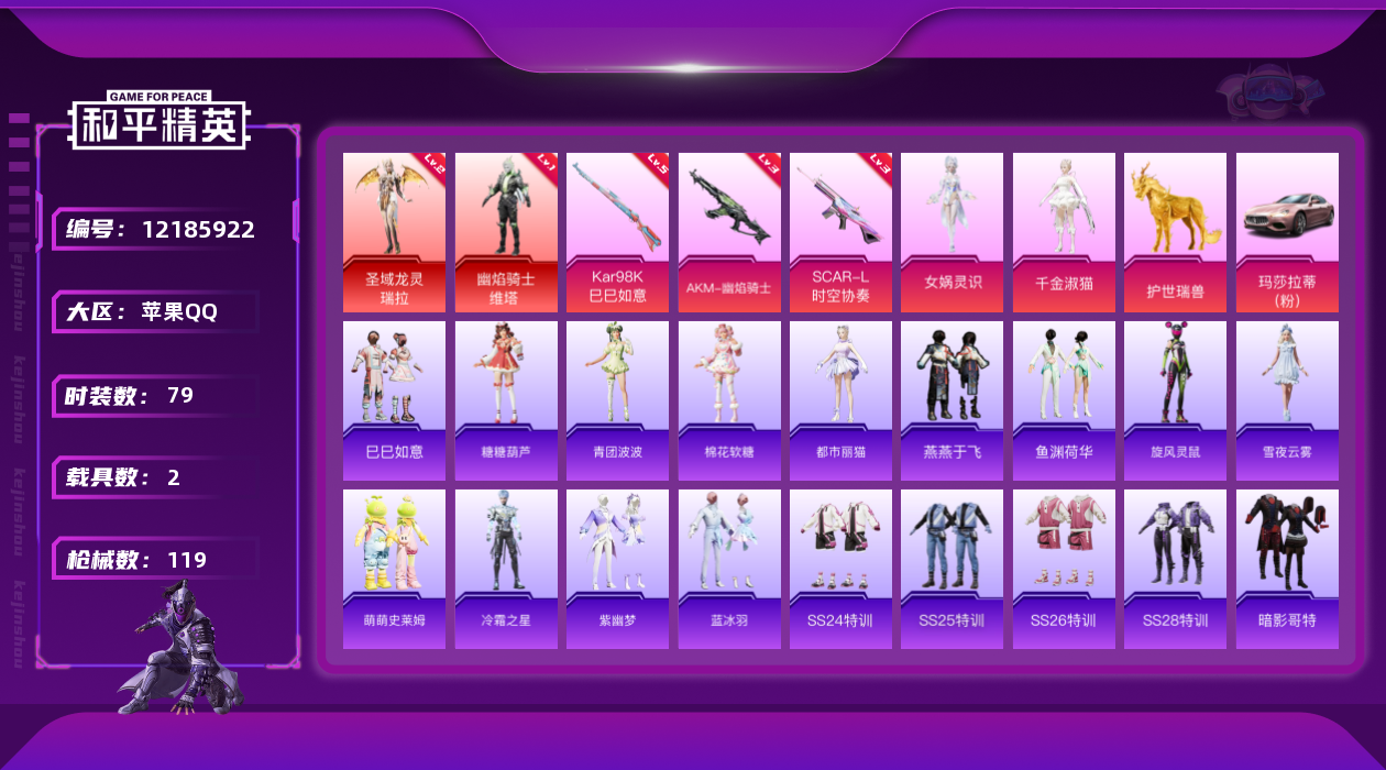 [12185922]地铁满天赋【商品标题】:苹果 手Q-2红装-4粉装-5特效枪-2载具-4.3w热力值-8印记-79套装-119枪皮【热门品类】:套装-奇异狩猎者【角色神装等级】:圣域龙灵-瑞拉(二级),幽焰骑士-维塔(一级)【稀有载具】:玛莎拉蒂Ghibli(粉),护世瑞兽【特效枪等级】:AKM-幽焰骑士(三级),SCAR-L-时空协奏(三级),M416-灵猫魔法师(三级),Kar98K-巳巳如意(五级),MG3-辉羽雀灵(四级MG-36-幻彩电音)【优质套装】:粉装-梦幻火箭,角色-千金淑猫,角色-女娲灵识,角色-绯穹魔姬【优质飞行器】:梦幻火箭飞行器,黄族统领飞行器,镜域双华-灵镜之阶,龙翔九天飞行器,幽焰列车飞行器,圣域金龙飞行器