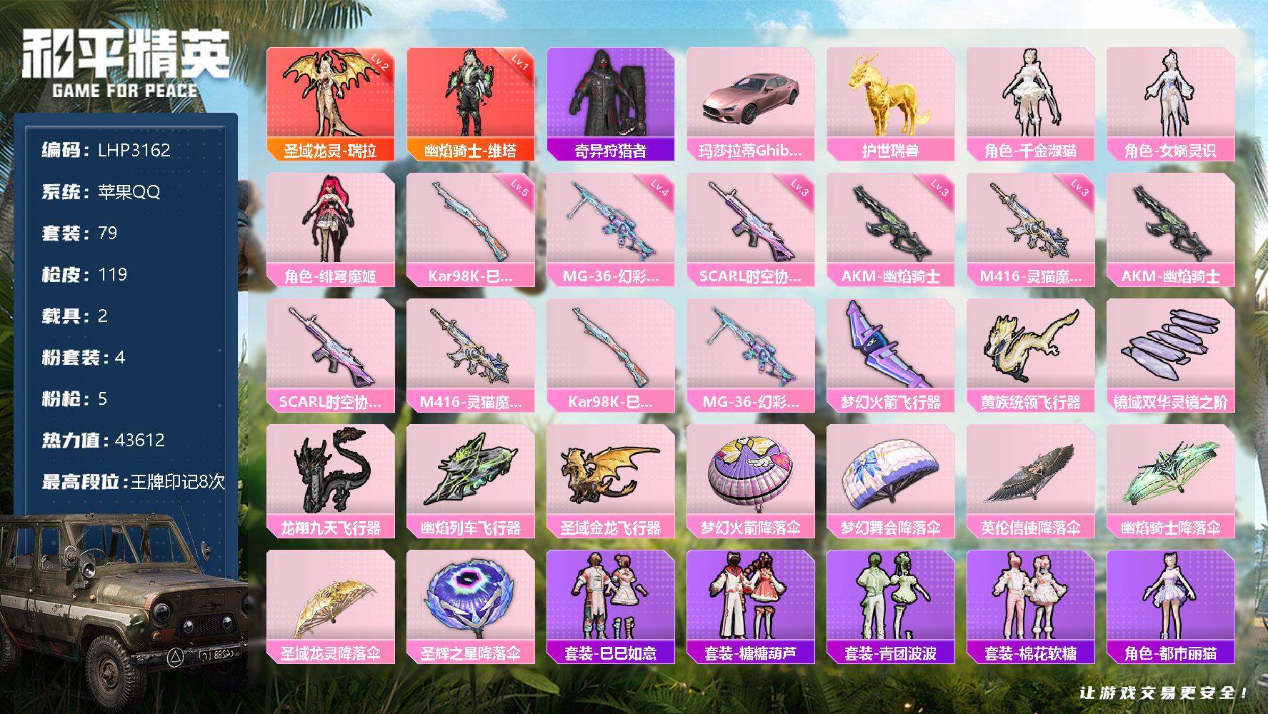 - PX_2097904-盛世惊鸿 狂魅哈莉 女娲 公主号】-YXc7963-【无二次实名-2025.7.4出二次】-果q-1红装-3粉装-6升级枪-2载具【因赛季更新游戏段付以上号为准!】 苹果Q- 5王牌印记 历史卓越王牌12星 46套装 82枪皮 【2载具】 宝马M4(圣保罗黄) 晶梦灵驹 【1神装】 盛世惊鸿-云鸾 (3级) 【3粉装】 狂魅哈莉 女娲灵识 樱桃泡泡 【6特效枪】 Kar98