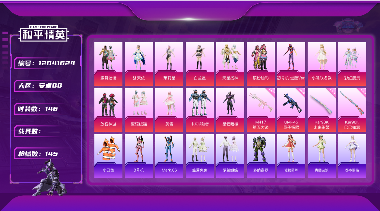 [12041624]素材身法号/老101/绝世印记1/地铁满天赋【特价急出/详情看图】:安卓 手Q-14粉装-4特效枪-3粉色飞行器-5.2w热力值-8王牌印记-146套装-145枪皮【热门品类】:粉装-缤纷油彩,套装-火箭少女101,套装-小丑鱼,套装-动感兔斯基人偶服,套装-龟仙人,角色-8号机,角色-Mark.06【粉色套装】:粉装-蝶舞迷情,粉装-缤纷油彩,粉装-放客神游,粉装-彩虹鹿灵,角色-洛天依,粉装-天星战神,角色-白兰星,角色-茉莉星,角色-星云暗核,角色-小叽联名款,粉装-蜜语绒猫,角色-美雪,角色-初号机 觉醒Ver.,粉装-未来领航者【粉色枪皮等级】:UMP45-量子极限(五级),Kar98K-未来歌姬(五级),Kar98K-巳巳如意(五级),M417-第五大道(七级)【粉色飞行器】:春暖花开飞行器,星夜魔法师飞行翼,夜幕颂歌飞行器