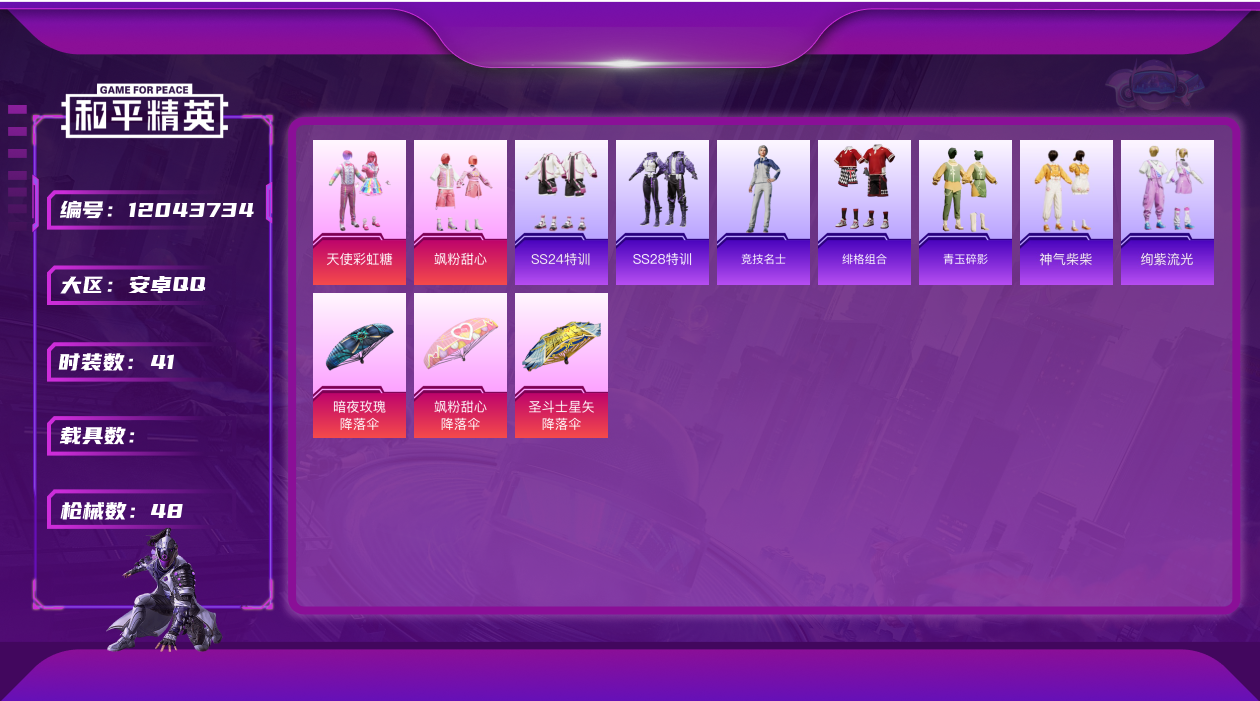 [12043734]【特价急出/详情看图】:安卓 手Q-3粉装-1特效枪-1.5w热力值-4王牌印记-41套装-48枪皮【热门品类】:套装-龟仙人【粉色套装】:粉装-天使彩虹糖,粉装-飒粉甜心,角色-天穹【粉色枪皮等级】:DP-28-豹影疾电(五级)