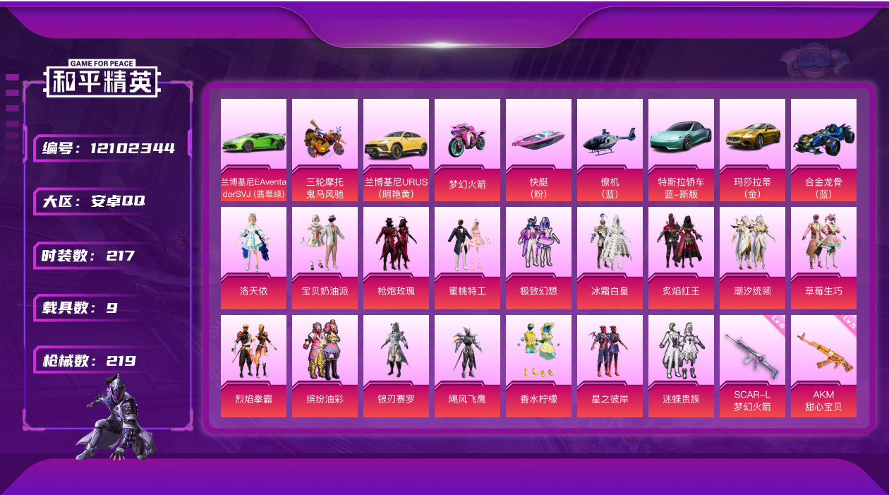 [12102344]素材身法号【特价急出/详情看图】:安卓 手Q-17粉装-10特效枪-9载具-5粉色飞行器-10.4w热力值-9王牌印记-217套装-219枪皮【热门品类】:粉装-梦幻火箭,粉装-缤纷油彩,套装-小丑鱼,套装-奇异狩猎者,套装-金羽特工,套装-龟仙人,套装-暗影哥特,套装-浪漫波比,套装-粉红小猪,小恶魔头饰【粉色载具】:特斯拉Roadster(水滴蓝),兰博基尼Aventador SVJ(翡翠绿),兰博基尼URUS(明艳黄),玛莎拉蒂Ghibli(金),合金龙骨(蓝),双人摩托-梦幻火箭,鬼马风驰,空客H135-蔚蓝之翼,快艇-塞莎KL27(霓虹粉)【粉色套装】:粉装-宝贝奶油派,粉装-梦幻火箭,粉装-缤纷油彩,粉装-极致幻想,粉装-潮汐统领,粉装-迷蝶贵族,粉装-草莓生巧,粉装-银刃赛罗,粉装-冰霜白皇,粉装-炙焰红王,粉装-香水柠檬,粉装-星之彼岸,粉装-烈焰拳霸,粉装-飓风飞鹰,粉装-枪炮玫瑰,粉装-蜜桃特工,角色-洛天依【粉色枪皮等级】:AKM-甜心宝贝(五级),SCAR-L-梦幻火箭(六级),M416-五爪金龙(五级),GROZA-香水柠檬(五级),AUG-暖羊咩咩(五级),M762-激战未来(五级),汤姆逊-怪笑疯兔(五级),Kar98K-巳巳如意(五级),VSS-烈焰拳霸(四级),DP-28-豹影疾电(四级)【粉色飞行器】:梦幻火箭飞行器,潮汐统领飞行器,夏日绵绵冰飞行器,终极赛罗飞行器,相思残雪飞行器