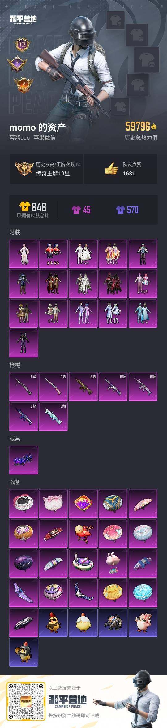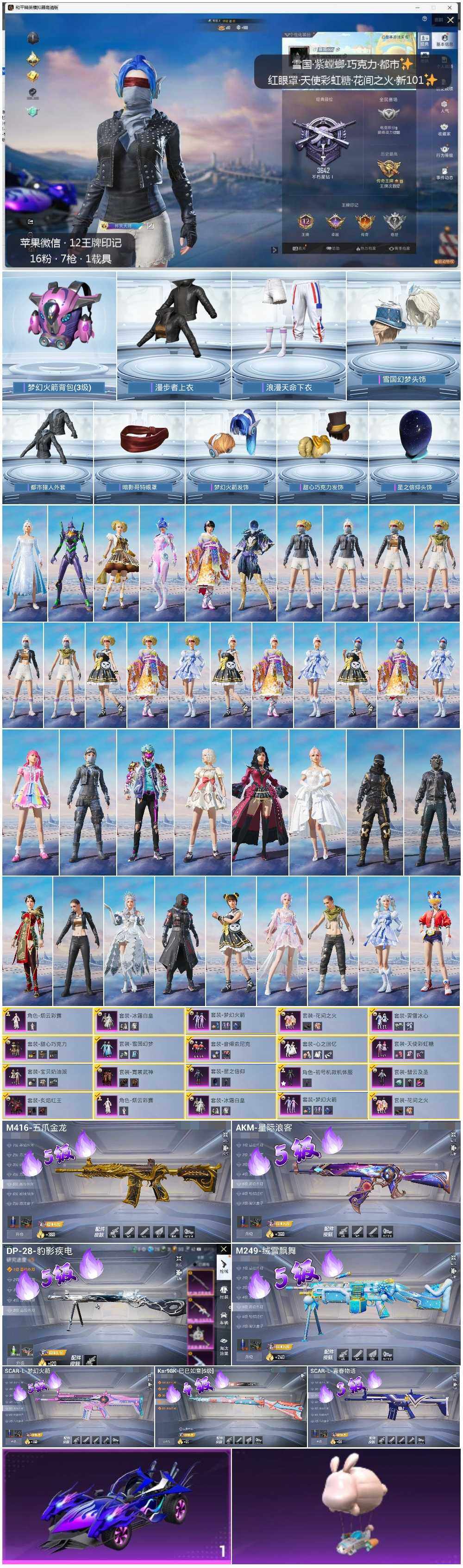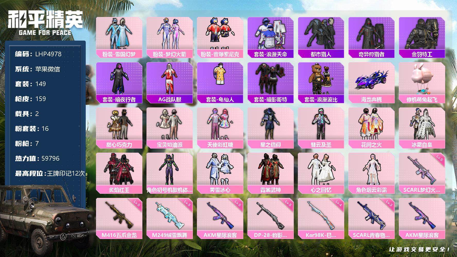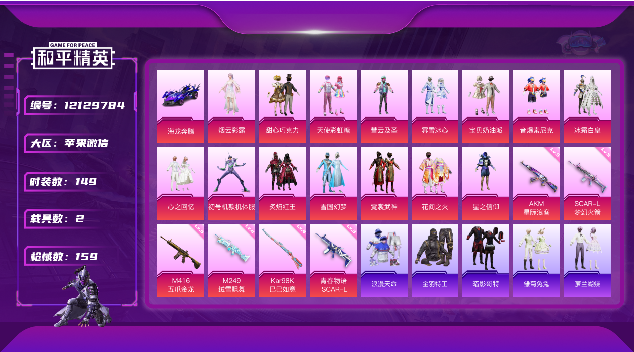 [12129784]素材身法号【特价急出/详情看图】:苹果 微信-16粉装-7特效枪-2载具-4粉色飞行器-5.9w热力值-12王牌印记-149套装-159枪皮【热门品类】:粉装-雪国幻梦,粉装-梦幻火箭,粉装-音爆索尼克,套装-浪漫天命,套装-都市猎人,套装-奇异狩猎者,套装-金羽特工,套装-暗夜行者,套装-AG战队服,套装-龟仙人,套装-暗影哥特,套装-浪漫波比【粉色载具】:海龙奔腾,僚机-萌兔起飞【粉色套装】:粉装-甜心巧克力,粉装-宝贝奶油派,粉装-天使彩虹糖,粉装-雪国幻梦,粉装-梦幻火箭,粉装-星之信仰,粉装-彗云及圣,粉装-花间之火,粉装-冰霜白皇,粉装-炙焰红王,角色-初号机款机体服,粉装-霁雪冰心,粉装-霓裳武神,粉装-音爆索尼克,粉装-心之回忆,角色-烟云彩露【粉色枪皮等级】:AKM-星际浪客(五级),SCAR-L-梦幻火箭(五级),SCAR-L-青春物语(三级),M416-五爪金龙(五级),Kar98K-巳巳如意(四级),M249-绒雪飘舞(五级),DP-28-豹影疾电(五级)【粉色飞行器】:梦幻火箭飞行器,青春物语飞行器,太空嘟嘟飞行器,歌者泠鸢飞行器