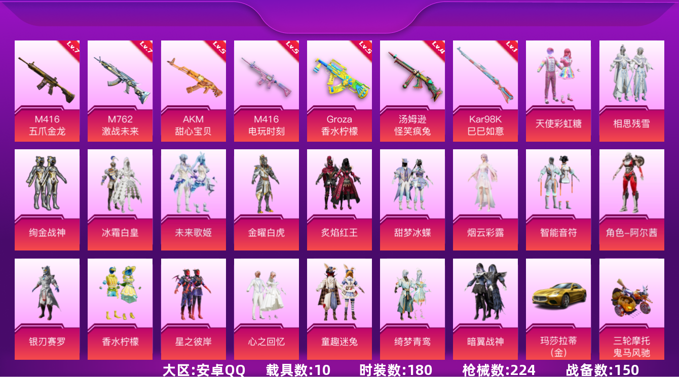 [12157904]素材身法号【特价急出/详情看图】:安卓 手Q-19粉装-7特效枪-10载具-3粉色飞行器-9.3w热力值-8王牌印记-180套装-224枪皮【热门品类】:粉装-梦幻火箭,粉装-童趣迷兔,套装-浪漫天命,套装-小丑鱼,套装-胖达圆圆,套装-AG战队服,套装-龟仙人,套装-浪漫波比,套装-粉红小猪,角色-Mark.06,熔岩游骑兵面罩,熔岩游骑兵连帽夹克 【粉色载具】:特斯拉Roadster(水滴蓝),阿斯顿马丁DBX(橙),玛莎拉蒂Ghibli(金),玛莎拉蒂Ghibli(粉),迈凯伦570S(天际蓝),灵鼠银迹,萌喵橘座,双人摩托-双刃魅影(绿),鬼马风驰,空客H135-蔚蓝之翼【粉色套装】:粉装-天使彩虹糖,粉装-金曜白虎,粉装-梦幻火箭,粉装-智能音符,粉装-绚金战神,粉装-银刃赛罗,粉装-冰霜白皇,粉装-童趣迷兔,粉装-炙焰红王,粉装-香水柠檬,粉装-暗翼战神,粉装-绮梦青鸾,粉装-星之彼岸,粉装-相思残雪,粉装-甜梦冰蝶,粉装-心之回忆,粉装-未来歌姬,角色-阿尔茜,角色-烟云彩露【粉色枪皮等级】:AKM-甜心宝贝(五级),M416-五爪金龙(七级),M416-电玩时刻(五级),GROZA-香水柠檬(五级),M762-激战未来(七级),汤姆逊-怪笑疯兔(四级),Kar98K-巳巳如意(一级)【粉色飞行器】:激战未来飞行器,终极赛罗飞行器,庄周梦蝶飞行器