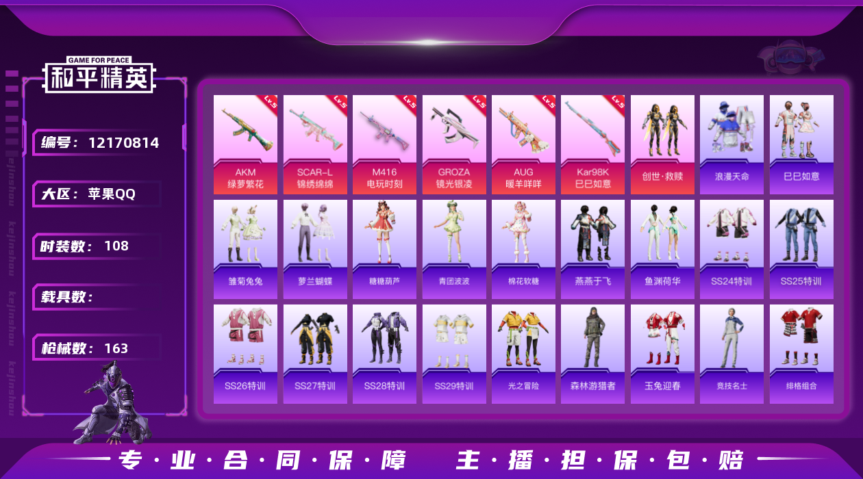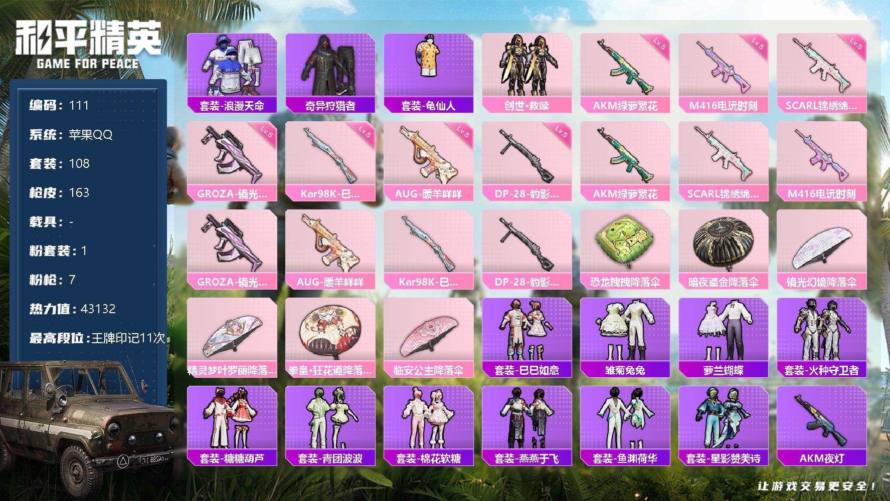 [12170814]【商品标题】:苹果 手Q-1粉装-7特效枪-0载具-0粉色飞行器-43132热力值-11王牌印记-108套装-163枪皮