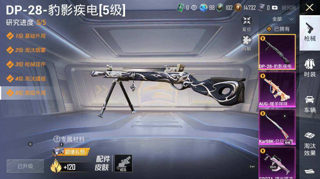 【粉色枪皮等级】:AKM-绿萝繁花(五级),SCAR-L-锦绣绵绵(五级),M416-电玩时刻(五级),GROZA-镜光银凌(五级),AUG-暖羊咩咩(五级),Kar98K-巳巳如意(五级),DP-28-豹影疾电(五级)