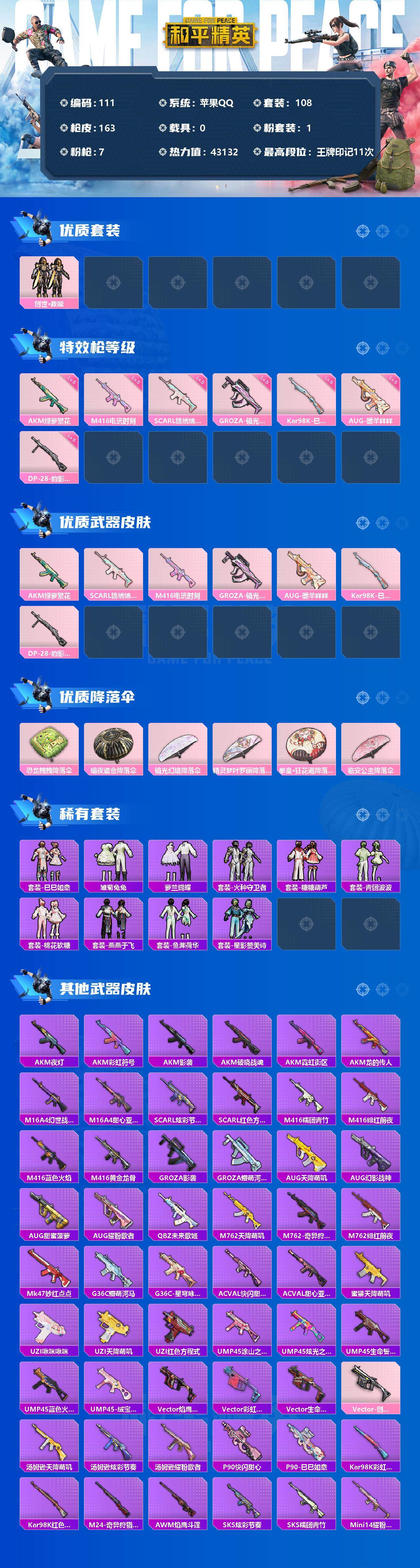 [12170814]【商品标题】:苹果 手Q-1粉装-7特效枪-0载具-0粉色飞行器-43132热力值-11王牌印记-108套装-163枪皮 【热门品类】:套装-浪漫天命,套装-奇异狩猎者,套装-龟仙人 【粉色套装】:套装-创世·救赎 【粉色枪皮等级】:AKM-绿萝繁花(五级),SCAR-L-锦绣绵绵(五级),M416-电玩时刻(五级),GROZA-镜光银凌(五级),AUG-暖羊咩咩(五级),Kar98K-巳巳如意(五级),DP-28-豹影疾电(五级) 【粉色枪皮】:AKM-绿萝繁花,SCAR-L-锦绣绵绵,M416-电玩时刻,GROZA-镜光银凌,AUG-暖羊咩咩,Kar98K-巳巳如意,DP-28-豹影疾电 【粉色降落伞】:恐龙拽拽降落伞,暗夜鎏金降落伞,镜光幻境降落伞,精灵梦叶罗丽降落伞,拳皇·狂花道降落伞,临安公主降落伞 【稀有套装】:套装-龟仙人,套装-巳巳如意,套装-雏菊兔兔,套装-萝兰蝴蝶,套装-火种守卫者,套装-糖糖葫芦,套装-青团波波,套装-棉花软糖,套装-燕燕于飞,套装-鱼渊荷华,套装-星影赞美诗 【稀有枪皮】:AKM-夜灯,AKM-彩虹符号,AKM-影袭,AKM-破晓战魂,AKM-霓虹街区,AKM-龙的传人,M16A4-幻世战舞者,M16A4-甜心亚梦,SCAR-L-炫彩节奏,SCAR-L-红色方程式,M416-糯团青竹,M416-绯红前夜,M416-蓝色火焰,M416-黄金龙骨,GROZA-影袭,GROZA-懵萌河马,AUG-天降萌叽,AUG-幻影战神,AUG-甜蜜菠萝,AUG-耀粉歌者,QBZ-未来歌姬,M762-天降萌叽,M762-奇异狩猎者,M762-绯红前夜,Mk47-妙红点点,G36C-懵萌河马,G36C-星穹咏叹调,AC-VAL-快闪甜心,AC-VAL-甜心亚梦,蜜獾-天降萌叽,UZI-啾咪啾咪,UZI-天降萌叽,UZI-红色方程式,UMP45-涂山之恋,UMP45-炫光之旅,UMP45-生命誓言,UMP45-蓝色火焰,UMP45-绒宝小鹅,Vector-焰鹰斗篷,Vector-彩虹符号,Vector-生命誓言,Vector-创世·救赎,汤姆逊-天降萌叽,汤姆逊-炫彩节奏,汤姆逊-耀粉歌者,P90-快闪甜心,P90-巳巳如意,Kar98K-彩虹符号,Kar98K-红色方程式,M24-奇异狩猎者,AWM-焰鹰斗篷,SKS-炫彩节奏,SKS-糯团青竹,