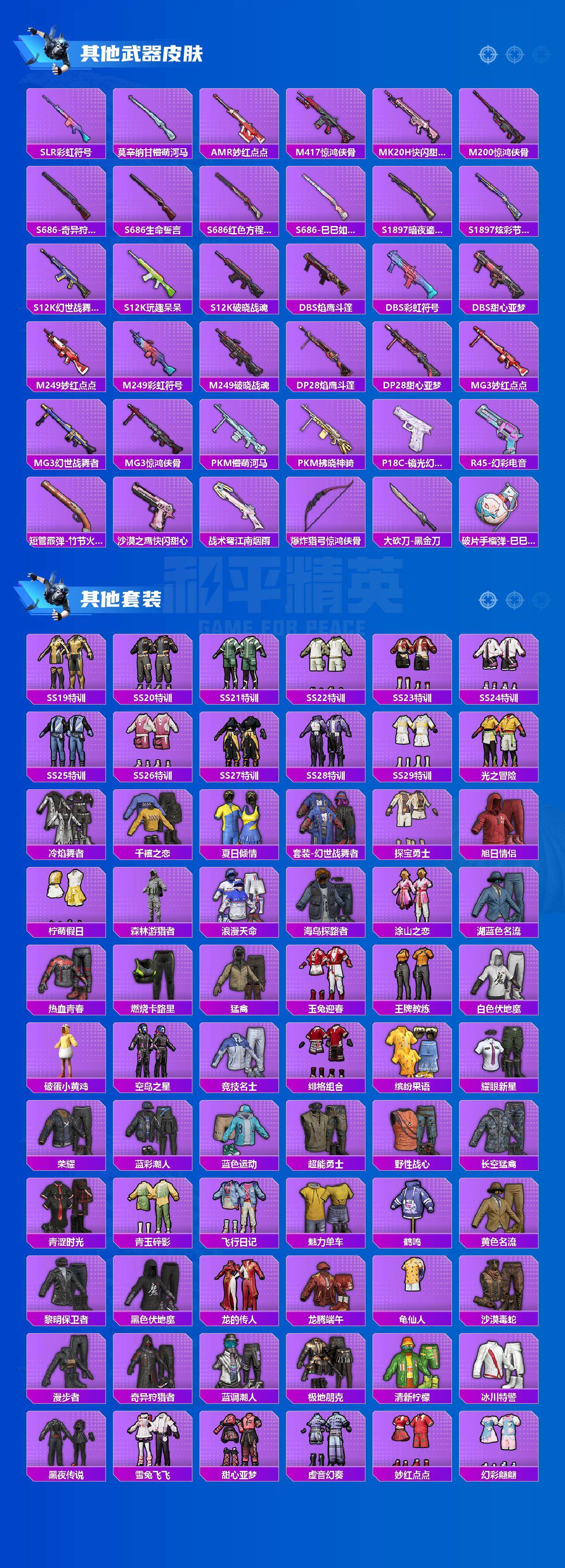 【稀有枪皮】:AKM-夜灯,AKM-彩虹符号,AKM-影袭,AKM-破晓战魂,AKM-霓虹街区,AKM-龙的传人,M16A4-幻世战舞者,M16A4-甜心亚梦,SCAR-L-炫彩节奏,SCAR-L-红色方程式,M416-糯团青竹,M416-绯红前夜,M416-蓝色火焰,M416-黄金龙骨,GROZA-影袭,GROZA-懵萌河马,AUG-天降萌叽,AUG-幻影战神,AUG-甜蜜菠萝,AUG-耀粉歌者,QBZ-未来歌姬,M762-天降萌叽,M762-奇异狩猎者,M762-绯红前夜,Mk47-妙红点点,G36C-懵萌河马,G36C-星穹咏叹调,AC-VAL-快闪甜心,AC-VAL-甜心亚梦,蜜獾-天降萌叽,UZI-啾咪啾咪,UZI-天降萌叽,UZI-红色方程式,UMP45-涂山之恋,UMP45-炫光之旅,UMP45-生命誓言,UMP45-蓝色火焰,UMP45-绒宝小鹅,Vector-焰鹰斗篷,Vector-彩虹符号,Vector-生命誓言,Vector-创世·救赎,汤姆逊-天降萌叽,汤姆逊-炫彩节奏,汤姆逊-耀粉歌者,P90-快闪甜心,P90-巳巳如意,Kar98K-彩虹符号,Kar98K-红色方程式,M24-奇异狩猎者,AWM-焰鹰斗篷,SKS-炫彩节奏,SKS-糯团青竹,