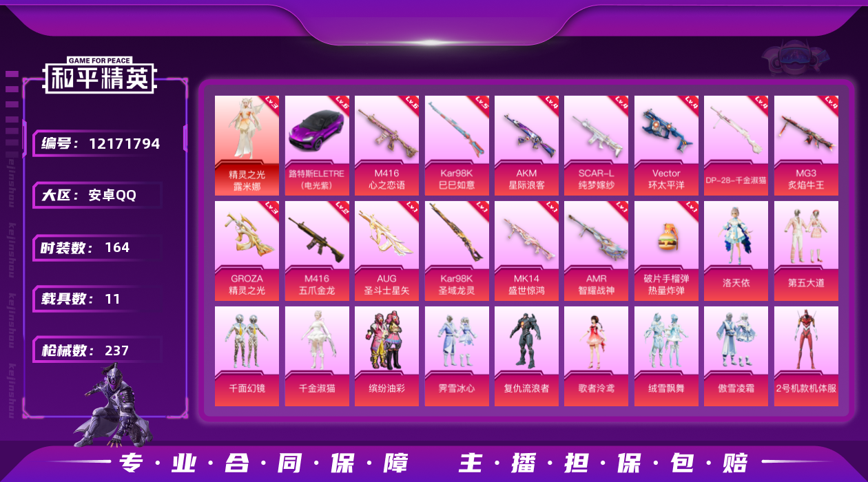 [12171794]MQ716安卓满级红车!3级露米娜! 手Q-1神装-14粉装-16特效枪-11载具-7粉色飞行器-100210热力值-13王牌印记-164套装-237枪皮 【红色载具】:路特斯ELETRE(电光紫)(六级) 【红色神装等级】:精灵之光-露米娜(三级) 【红色角色神装】:精灵之光-露米娜 【热门品类】:粉装-缤纷油彩,套装-浪漫天命,套装-都市猎人,套装-冥河战士,套装-深海小丑鱼,角色-军刀雅典娜,套装-龟仙人,套装-暗影哥特,套装-浪漫波比 【粉色载具】:兰博基尼Aventador SVJ(翡翠绿),兰博基尼Estoque(银翼灰),路特斯ELETRE(电光紫),玛莎拉蒂Ghibli(粉),迈凯伦570S(天际蓝),帕加尼imola(光影红),时空跃影(星辉银),合金龙骨(蓝),极速兔兔车,僚机-萌兔起飞,快艇-自由的鲸,护世瑞兽 【粉色套装】:粉装-缤纷油彩,角色-洛天依,角色-2号机款机体服,角色-复仇流浪者,粉装-绒雪飘舞,粉装-傲雪凌霜,粉装-霁雪冰心,粉装-千面幻镜,角色-歌者泠鸢,粉装-第五大道,粉装-炫光之旅,角色-千金淑猫,粉装-星穹咏叹调,角色-羊梦糖心 【粉色枪皮等级】:AKM-星际浪客(四级),SCAR-L-纯梦嫁纱(四级),M416-五爪金龙(二级),M416-心之恋语(六级),GROZA-精灵之光(三级),AUG-圣斗士星矢(一级),Vector-环太平洋(四级),AKS-74U-星穹咏叹调(一级),Kar98K-巳巳如意(五级),Kar98K-圣域龙灵(一级),Mk14-盛世惊鸿(一级),AMR-智耀战神(一级),DP-28-千金淑猫(四级),DP-28-豹影疾电(一级),MG3-炙焰牛王(四级),破片手榴弹-热量炸弹(一级) 【粉色枪皮】:AKM-星际浪客,SCAR-L-纯梦嫁纱,M416-五爪金龙,M416-心之恋语,GROZA-精灵之光,AUG-圣斗士星矢,Vector-环太平洋,AKS-74U-星穹咏叹调,Kar98K-巳巳如意,Kar98K-圣域龙灵,Mk14-盛世惊鸿,AMR-智耀战神,DP-28-千金淑猫,DP-28-豹影疾电,MG3-炙焰牛王,破片手榴弹-热量炸弹 【粉色飞行器】:甜蜜誓约飞行器,星夜魔法师飞行翼,歌者泠鸢飞行器,曦光华影飞行器,凤舞九天飞行器,圣域金龙飞行器,雀灵庇佑飞行器 【粉色降落伞】:幻影战神