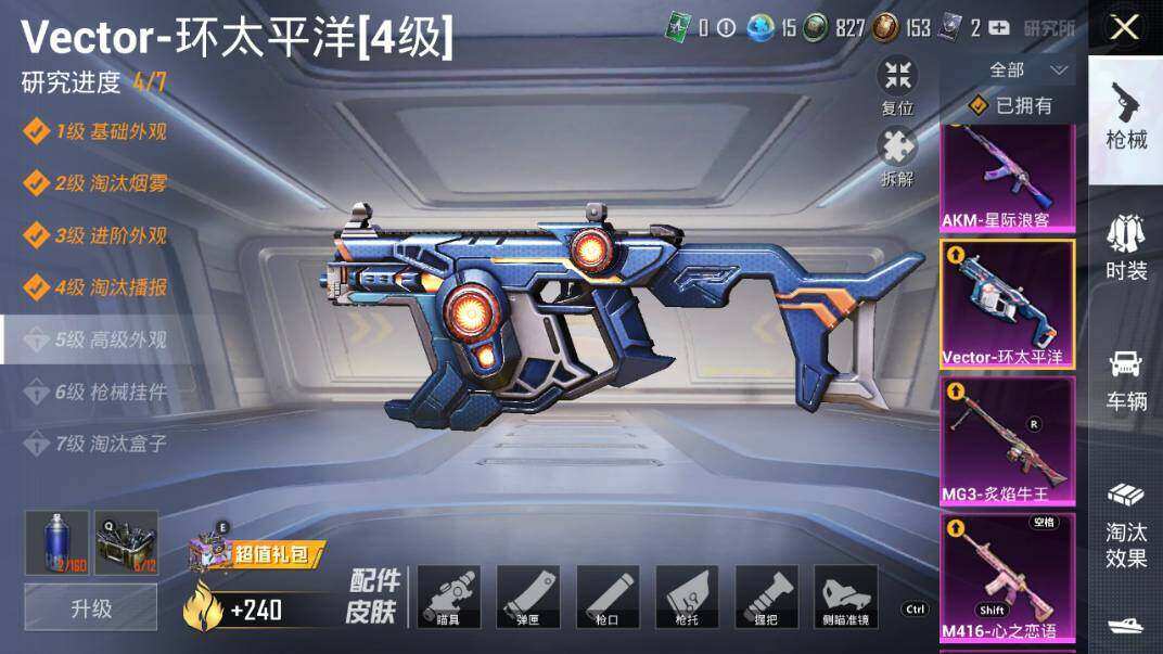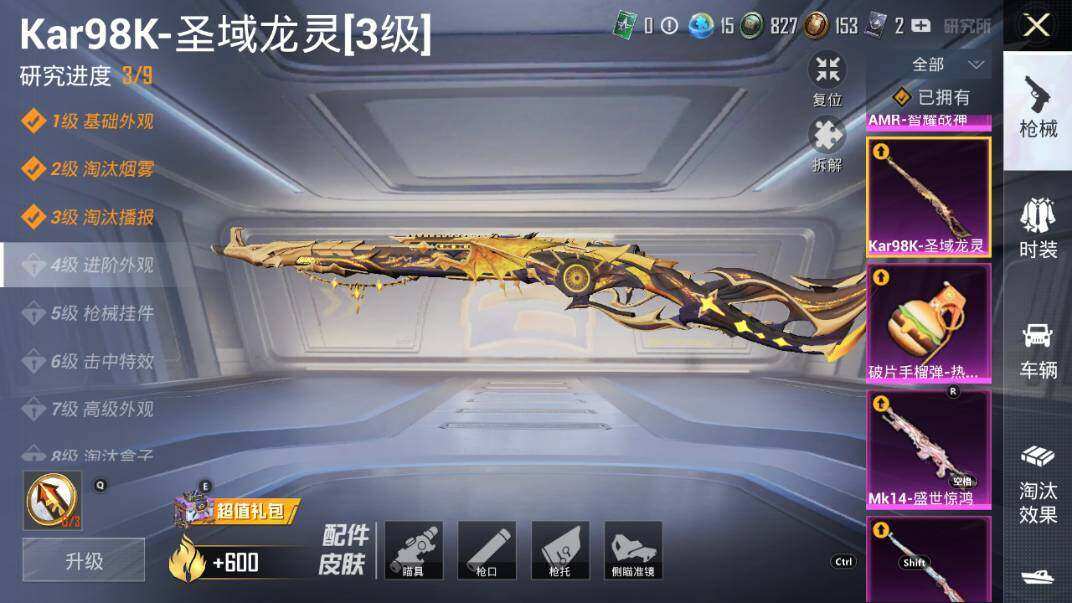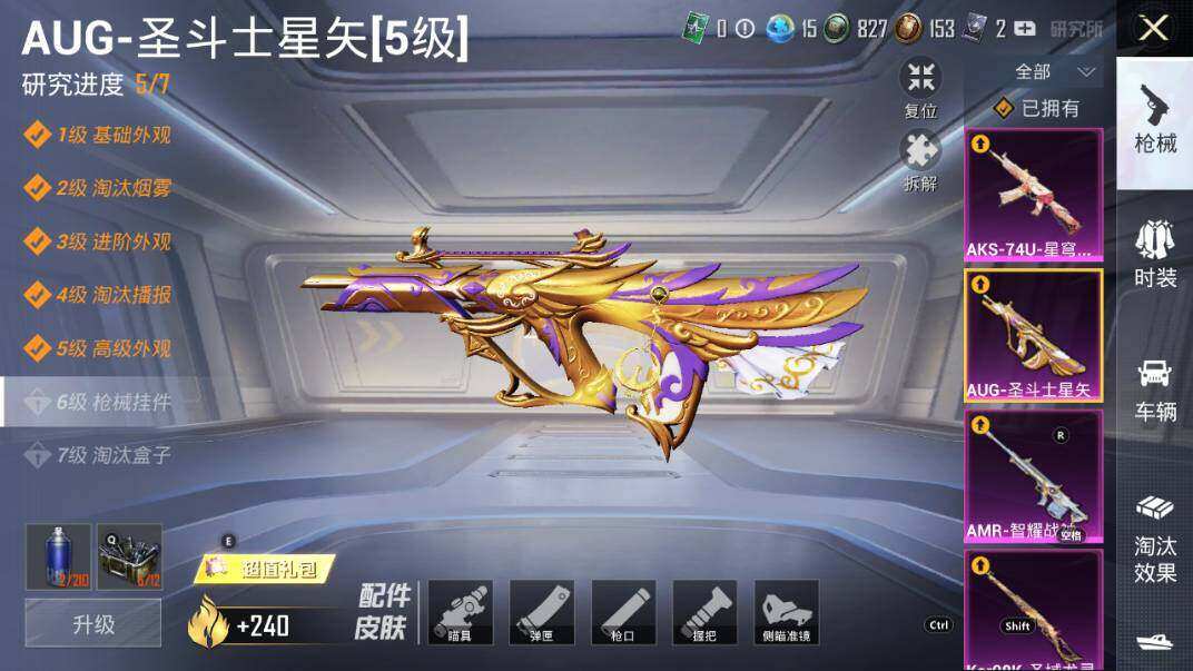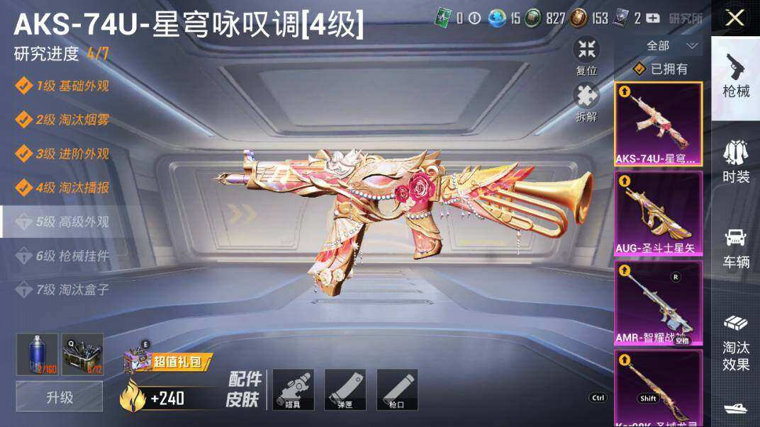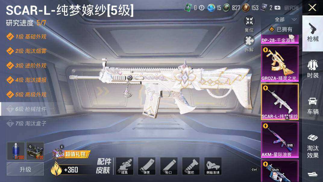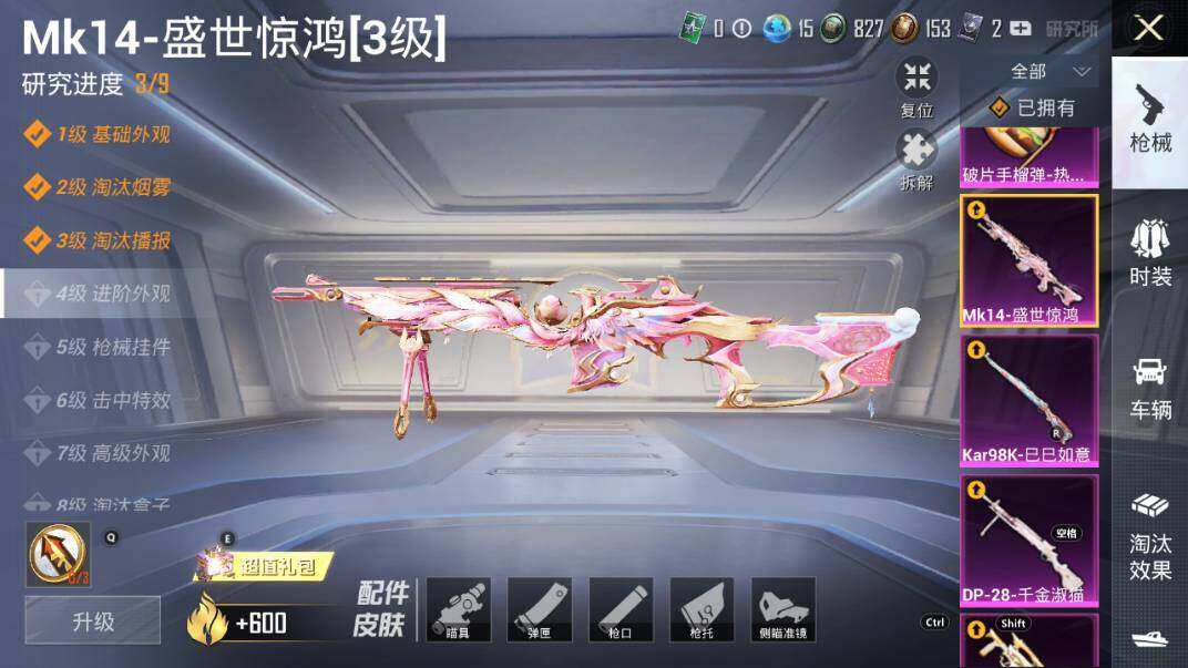 【粉色枪皮等级】:AKM-星际浪客(四级),SCAR-L-纯梦嫁纱(四级),M416-五爪金龙(二级),M416-心之恋语(六级),GROZA-精灵之光(三级),AUG-圣斗士星矢(一级),Vector-环太平洋(四级),AKS-74U-星穹咏叹调(一级),Kar98K-巳巳如意(五级),Kar98K-圣域龙灵(一级),Mk14-盛世惊鸿(一级),AMR-智耀战神(一级),DP-28-千金淑猫(四级),DP-28-豹影疾电(一级),MG3-炙焰牛王(四级),破片手榴弹-热量炸弹(一级)