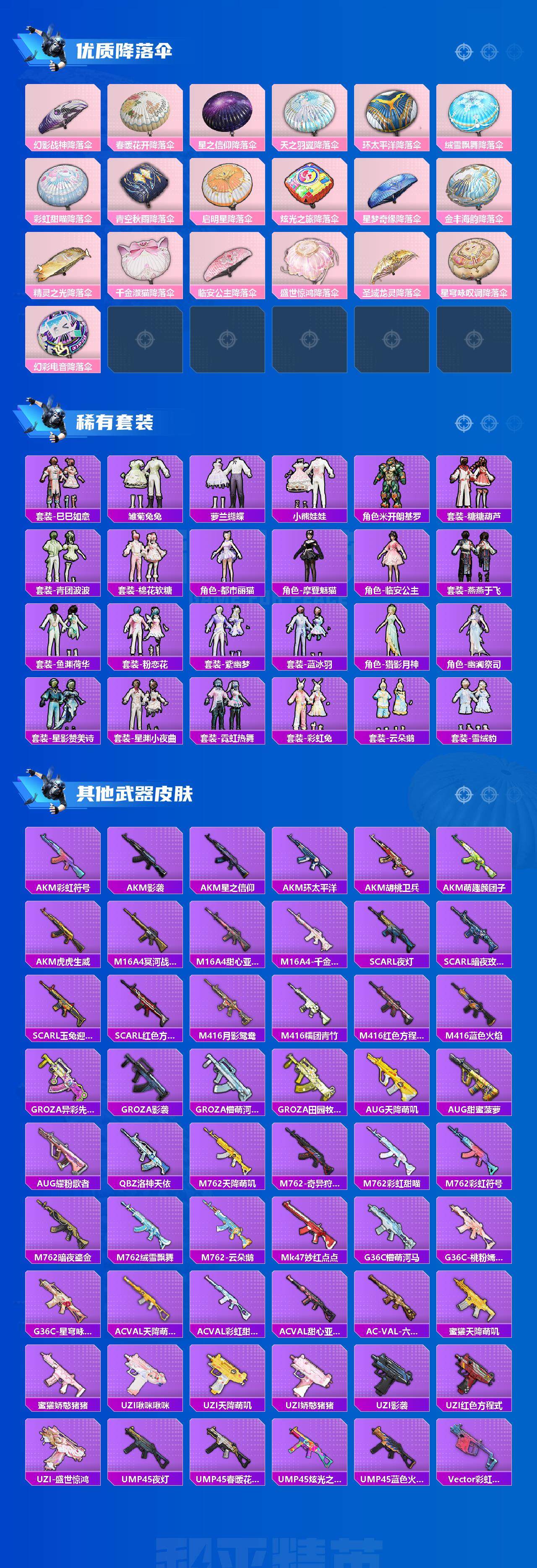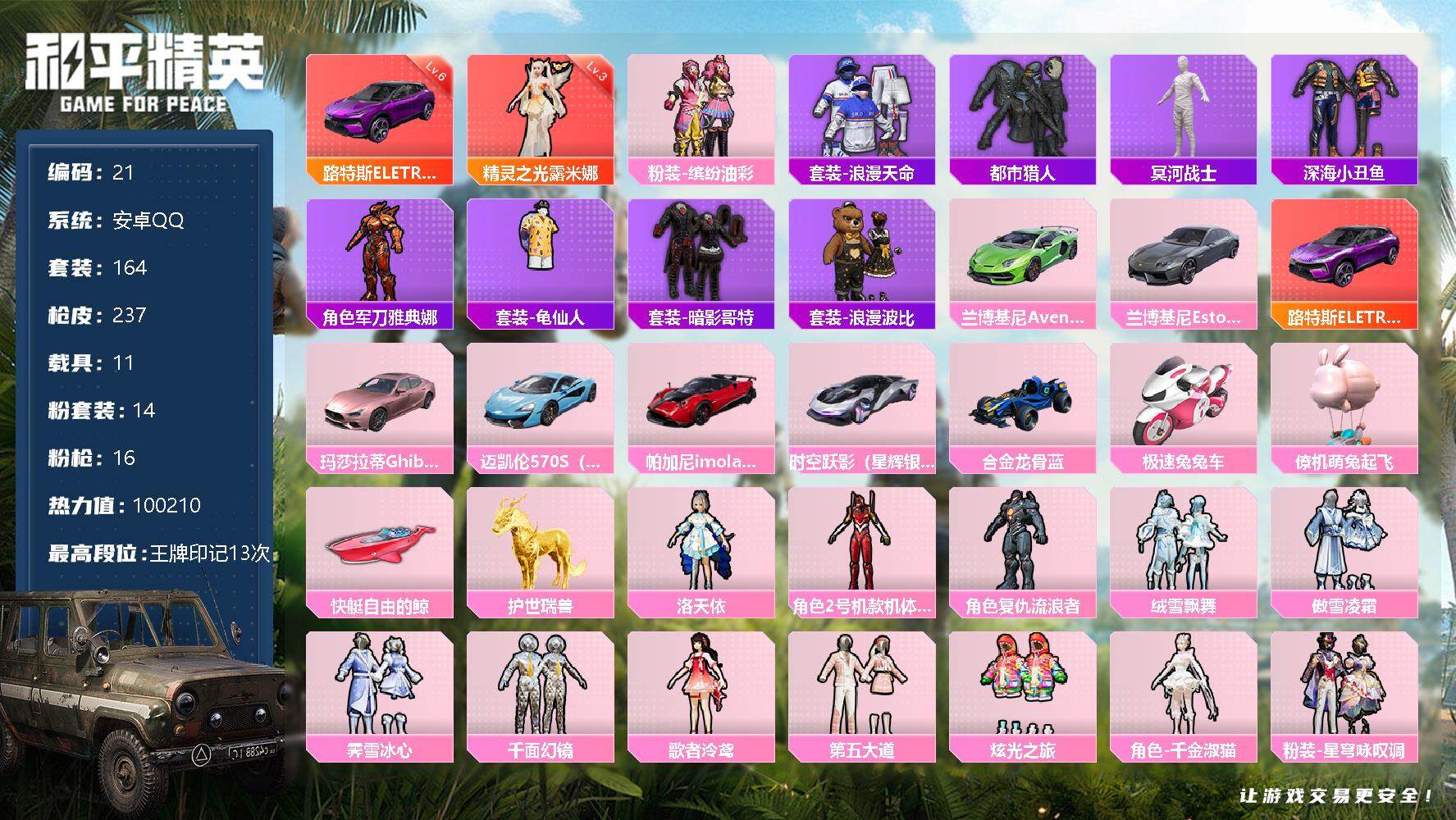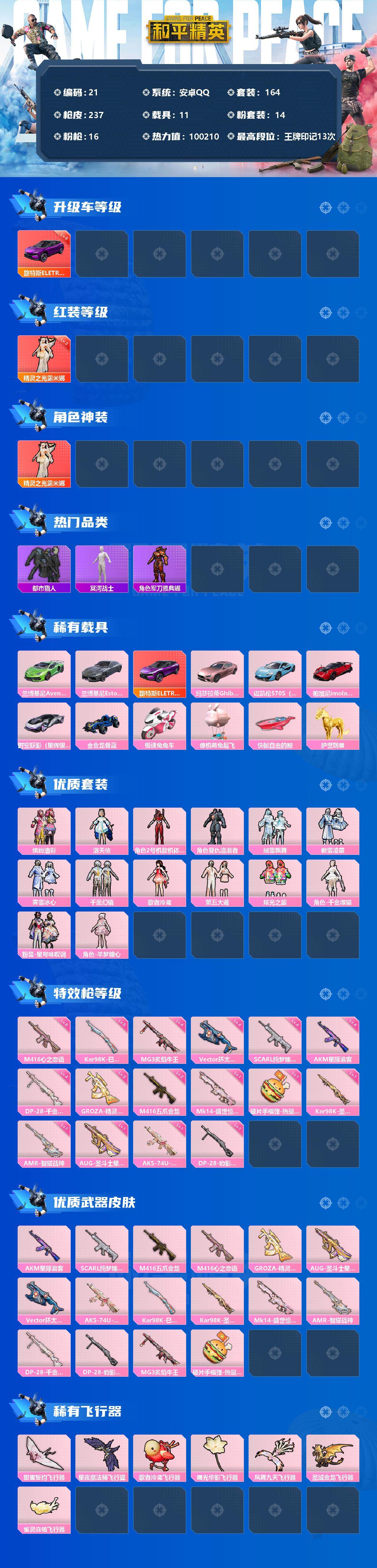 - [12458806]【商品标题】:安卓 手Q-6粉装-12特效枪-1载具-2粉色飞行器-107661热力值-17王牌印记-242套装-322枪皮 【热门品类】:套装-浪漫天命,套装-派对舞王,套装-深海小丑鱼,套装-龟仙人,套装-暗影哥特,套装-粉红小猪,角色-Mark.06 【粉色载具】:玛莎拉蒂Quattroporte(夜幕蓝) 【粉色套装】:粉装-天使彩虹糖,粉装-烈焰拳霸,粉装-飒粉甜心,粉装-蜜语绒猫,角色-月影灵韵,粉装-桃粉嫣然 【粉色枪皮等级】:AKM-绿萝繁花(五级),SCAR-L-锦绣绵绵(五级),M416-心之恋语(六级),GROZA-镜光银凌(五级),AUG-暖羊咩咩(五级),AKS-74U-星穹咏叹调(五级),Kar98K-巳巳如意(五级),Mk14-甜梦熊击(五级),MK12-雪月幻音(四级),DP-28-暗夜鎏金(四级),DP-28-豹影疾电(五级),MG3-炙焰牛王(四级) 【粉色枪皮】:AKM-绿萝繁花,SCAR-L-锦绣绵绵,M416-心之恋语,GROZA-镜光银凌,AUG-暖羊咩咩,AKS-74U-星穹咏叹调,Kar98K-巳巳如意,Mk14-甜梦熊击,MK12-雪月幻音,DP-28-暗夜鎏金,DP-28-豹影疾电,MG3-炙焰牛王 【粉色飞行器】:太空嘟嘟飞行器,雀灵庇佑飞行器 【粉色降落伞】:神秘黑猫降落伞,阿狸红降落伞,暗夜玫瑰降落伞,齐天大圣降落伞,蓝莓炮弹降落伞,环太平洋降落伞,垂柳戏鸭降落伞,旋转彩虹降落伞,第五大道降落伞,闲梦青缨降落伞,猪猪侠降落伞,蜜语绒猫降落伞,临安公主降落伞,脆鲨七海降落伞,金蛇镇世降落伞,墨金战记降落伞,幻彩电音降落伞 【稀有套装】:套装-龟仙人,套装-巳巳如意,角色-米开朗基罗,套装-糖糖葫芦,套装-青团波波,套装-棉花软糖,角色-都市丽猫,套装-燕燕于飞,套装-鱼渊荷华,角色-风玲,套装-晶辉守护,套装-粉恋花,套装-紫幽梦,套装-蓝冰羽,套装-霓虹热舞,套装-彩虹兔,套装-云朵鹅,套装-雪绒豹,玩偶服-喜羊羊 【稀有枪皮】:AKM-墨染幽兰,AKM-夜灯,AKM-彩虹符号,AKM-影袭,AKM-灼热熔岩,AKM-环太平洋,AKM-生命誓言,AKM-破晓战魂,AKM-缤纷海域,AKM-萌趣颜团子,AKM-虎虎生威,AKM-霓虹街区,AKM-龙的传人,M16A4-凝视深渊,M16A4-幻世战舞者,M16A