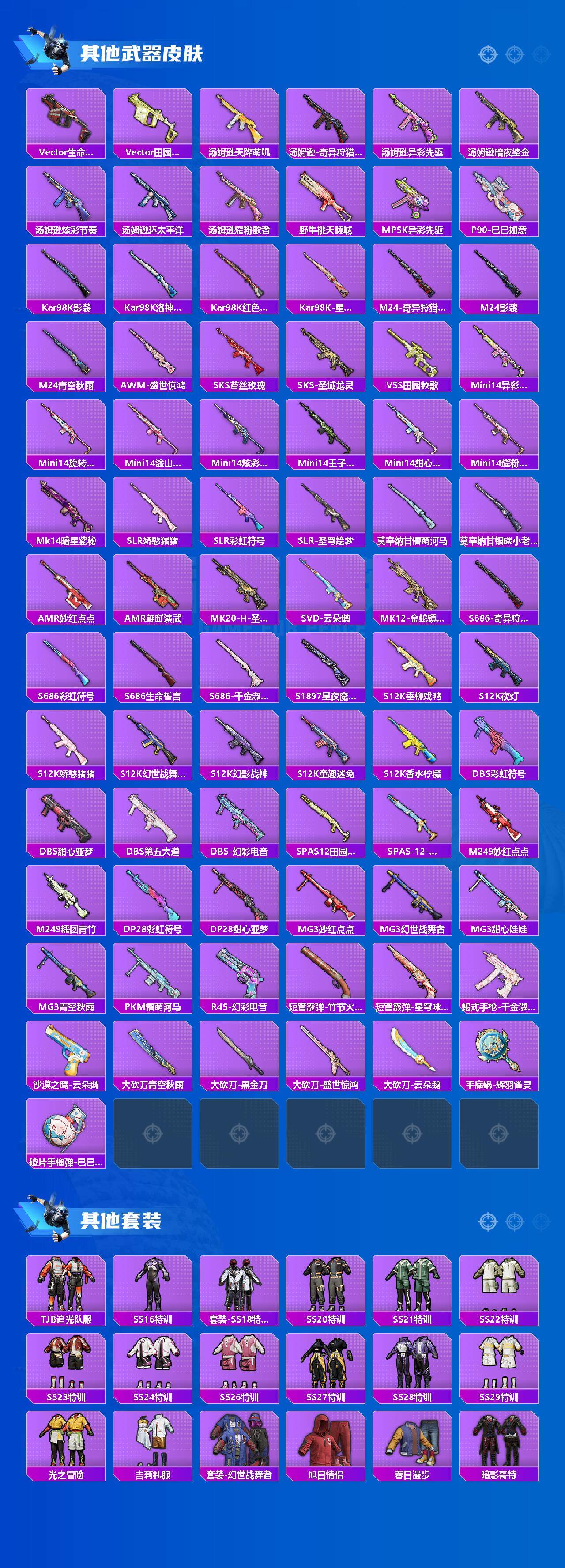 - [12235189]2特效枪 2印记 可二次 可修改实名 优质装备:Kar98K-巳巳如意 稀有枪皮:DP-28-豹影疾电 五级特效枪:五级Kar98K-巳巳如意,五级DP-28-豹影疾电 紫色装扮:SS30特训套装,SS31特训套装,SS33特训套装,顶瓜瓜,人气偶像,黑色伏地魔,冰河战士,蝶变,香桃花海,缤纷果语,SS29特训,星途旅人,巳巳如意,异域银装,竞技名士,都市丽猫,街头风暴,光矢逐梦,粉红小猪,大橘大利,SS32特训服(SS32特训套装),恋语绒绒 优质战备:星途旅人降落伞