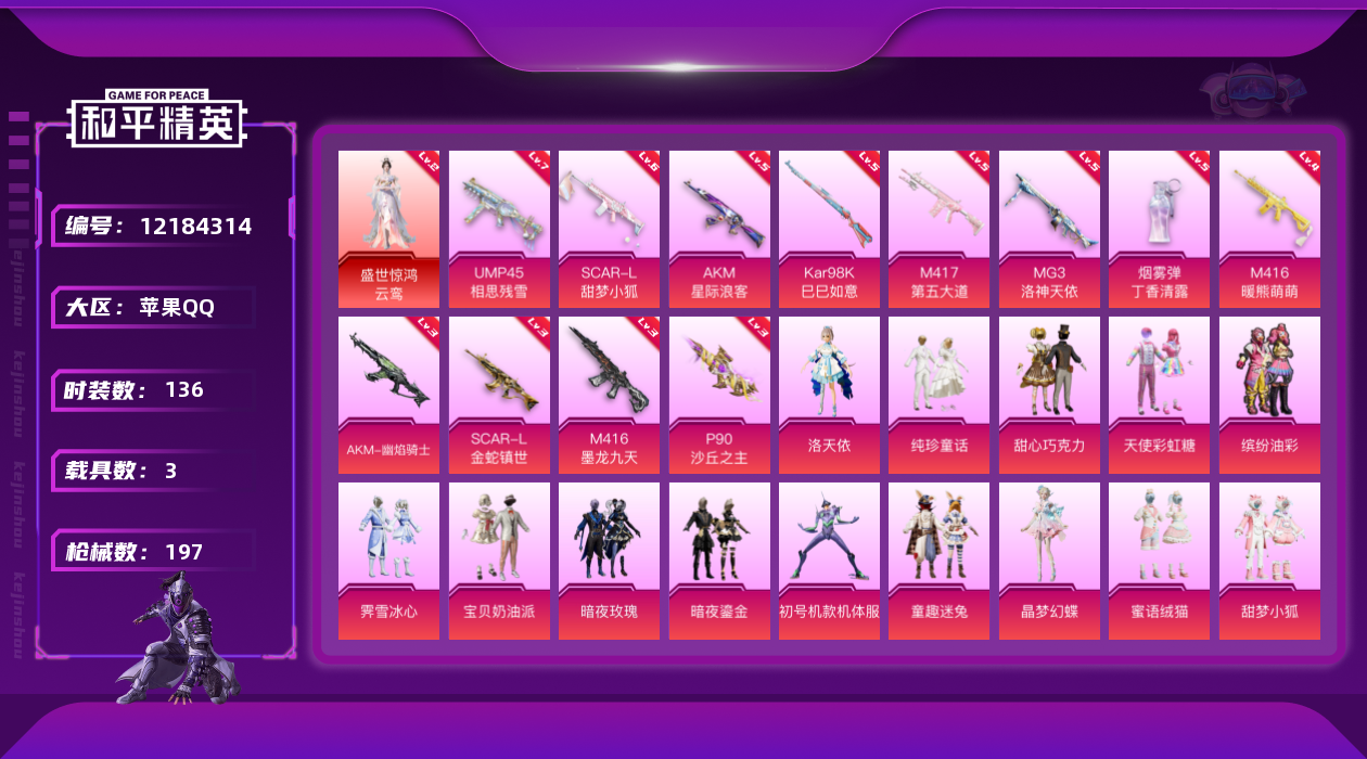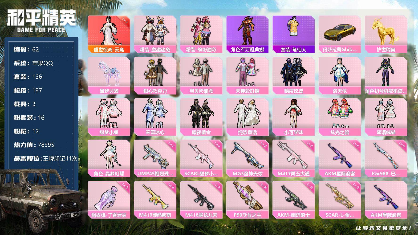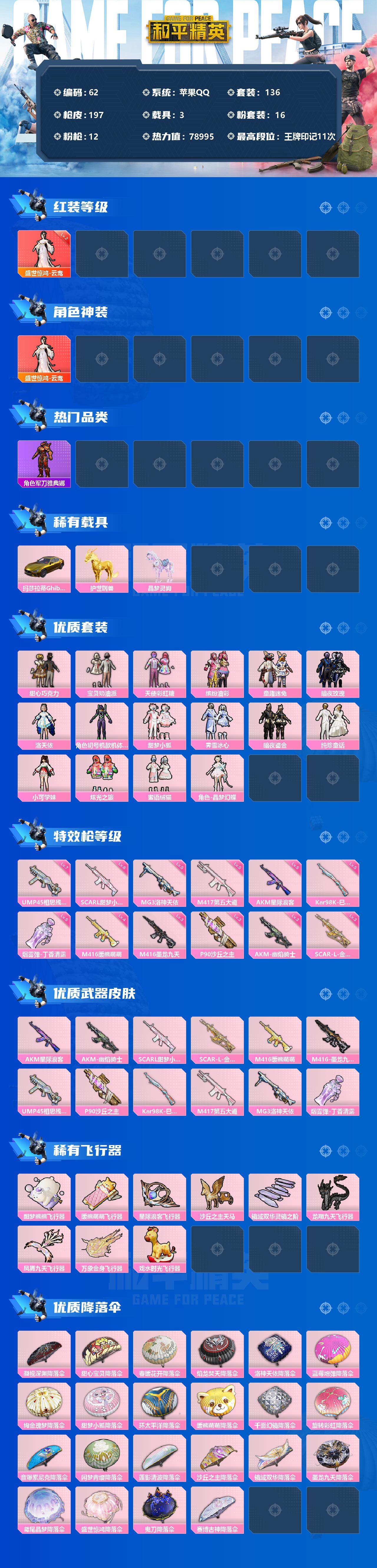 [12184314]身法素材号【特价急出/详情看图】:苹果 手Q-1神装-16粉装-12特效枪-3载具-10粉色飞行器-78995热力值-11王牌印记-136套装-197枪皮