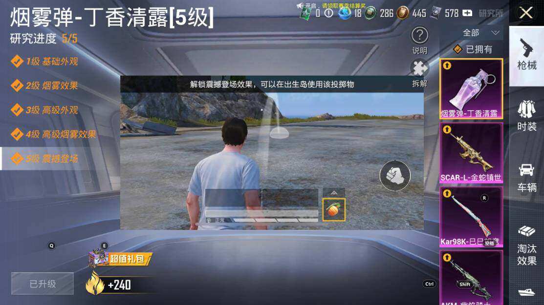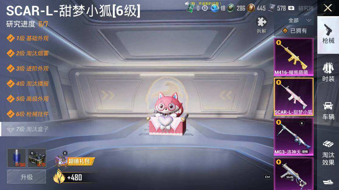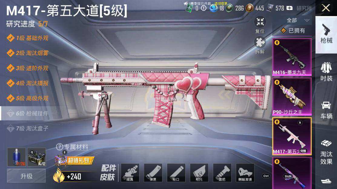 【粉色枪皮等级】:AKM-星际浪客(五级),AKM-幽焰骑士(三级),SCAR-L-甜梦小狐(六级),SCAR-L-金蛇镇世(三级),M416-暖熊萌萌(四级),M416-墨龙九天(三级),UMP45-相思残雪(七级),P90-沙丘之主(三级),Kar98K-巳巳如意(五级),M417-第五大道(五级),MG3-洛神天依(五级),烟雾弹-丁香清露(五级)