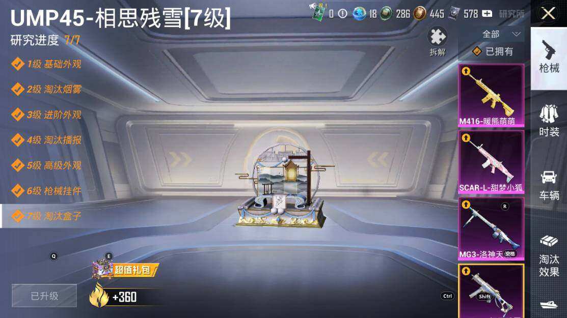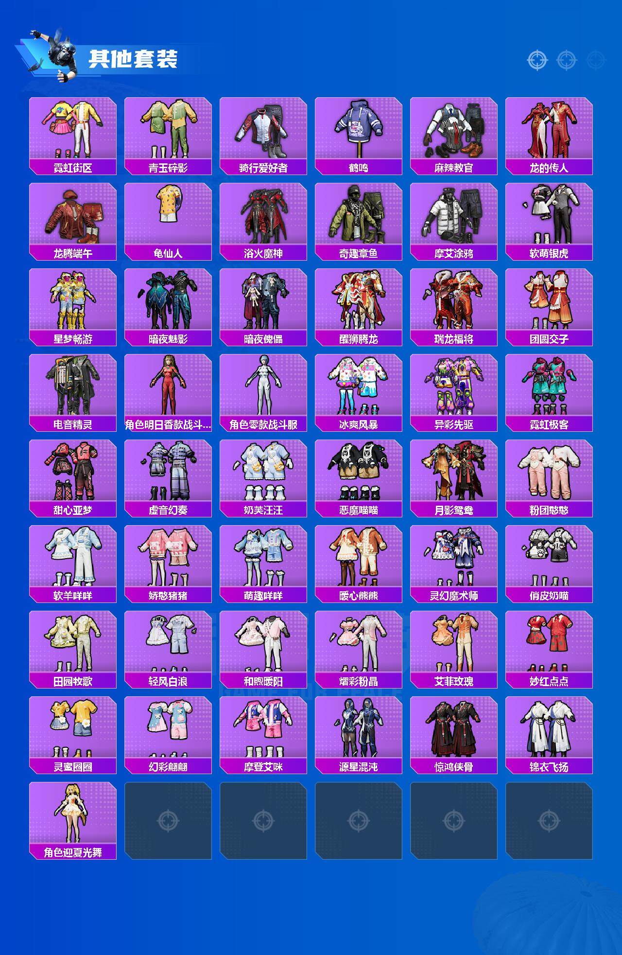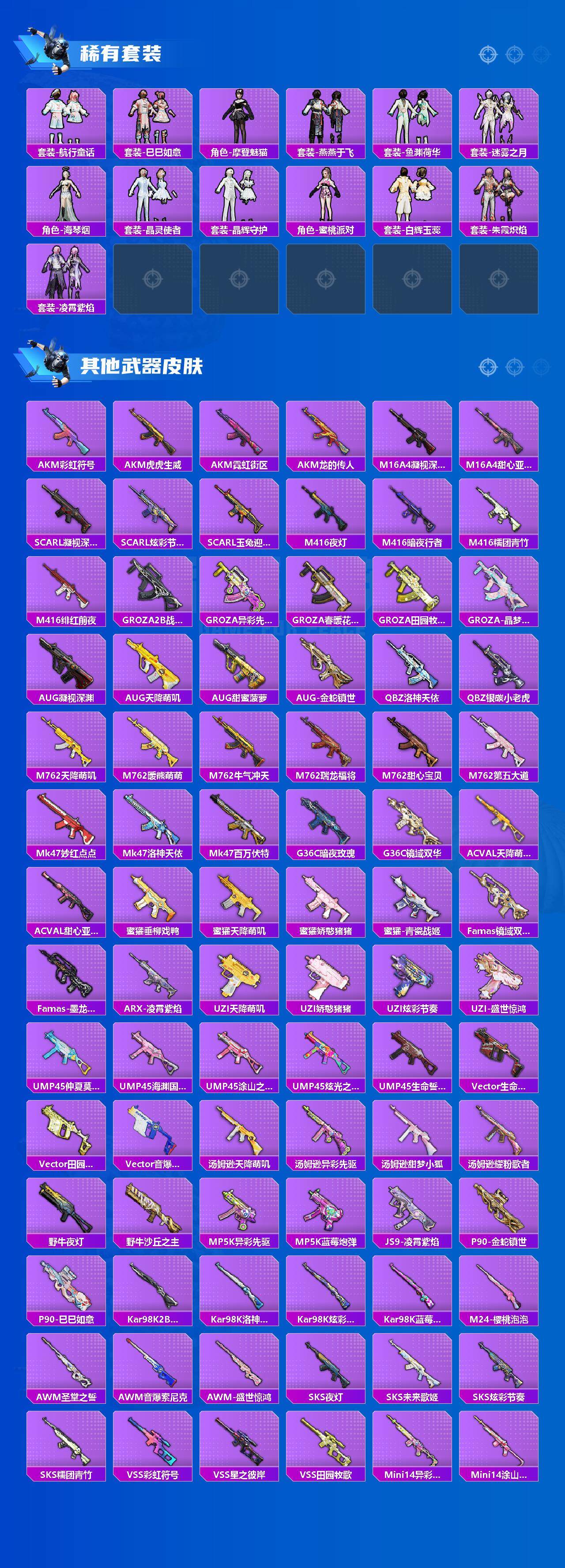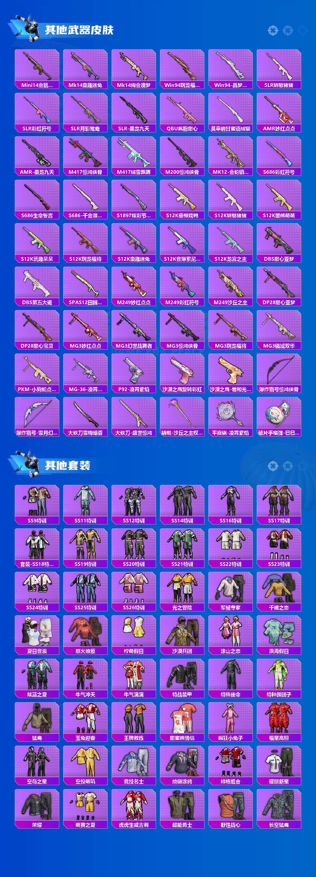 AKM-星际浪客,AKM-幽焰骑士,SCAR-L-甜梦小狐,SCAR-L-金蛇镇世,M416-暖熊萌萌,M416-墨龙九天,UMP45-相思残雪,P90-沙丘之主,Kar98K-巳巳如意,M417-第五大道,MG3-洛神天依,烟雾弹-丁香清露