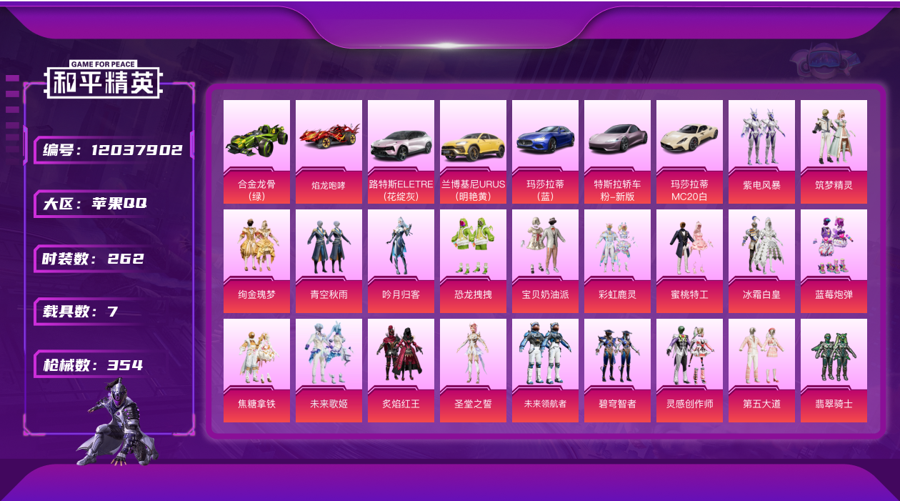 [12037902]老木乃伊【暑期末清货/特价急出/永久包赔】:苹果 手Q-27粉装-13特效枪-7载具-13.3w热力值-16印记-262套装-354枪皮【热门品类】:套装-冥河战士,套装-小丑鱼,套装-奇异狩猎者,角色-军刀雅典娜,套装-胖达团团,套装-金羽特工,套装-都市猎人,套装-动感兔斯基人偶服【稀有载具】:特斯拉Roadster(沁心粉),兰博基尼URUS(明艳黄),路特斯ELETRE(花绽灰),玛莎拉蒂MC20(星石白),玛莎拉蒂Ghibli(蓝),合金龙骨(绿),焰龙咆哮【特效枪等级】:AKM-炫紫旋律(六级),SCAR-L-机甲封神(五级),SCAR-L-青春物语(二级),M416-五爪金龙(五级),M416-至情至圣(九级),GROZA-香水柠檬(七级),M762-激战未来(五级),UMP45-相思残雪(七级),UMP45-恐龙拽拽(一级),Vector-环太平洋(五级),Kar98K-创世·救赎(四级),Kar98K-巳巳如意(三级),M249-蓝莓炮弹(四级)【优质套装】:粉装-极限特训,粉装-宝贝奶油派,粉装-梦幻火箭,粉装-花间之火,粉装-翡翠骑士,粉装-冰霜白皇,粉装-炙焰红王,粉装-香水柠檬,粉装-王牌四分卫,粉装-绿野柔风,粉装-蜜桃特工,粉装-暗夜玫瑰,粉装-彩虹鹿灵,粉装-吟月归客,粉装-蓝莓炮弹,粉装-绚金瑰梦,粉装-焦糖拿铁,粉装-恐龙拽拽,粉装-紫电风暴,粉装-筑梦精灵,粉装-灵感创作师,粉装-碧穹智者,粉装-青空秋雨,粉装-第五大道,粉装-未来歌姬,角色-圣堂之誓,粉装-未来领航者【优质飞行器】:锦绣火鲤飞行器,青春物语飞行器,龙翔九天飞行器