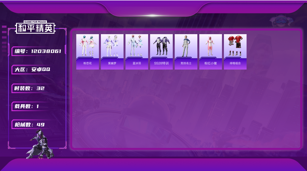 [12038061]【暑期末清货/特价急出/永久包赔】:安卓 手Q-1红装-1粉装-3特效枪-1载具-1.6w热力值-2印记-32套装-49枪皮【角色神装等级】:最终圣卫者-帕修斯(一级)【稀有载具】:最终圣卫者摩托车【特效枪等级】:Vector-最终圣卫者(三级),P90-冷漠罗丽(二级),MG3-辉羽雀灵(四级MG-36-幻彩电音)【优质套装】:粉装-幻彩电音【优质飞行器】:终晖之翼飞行器